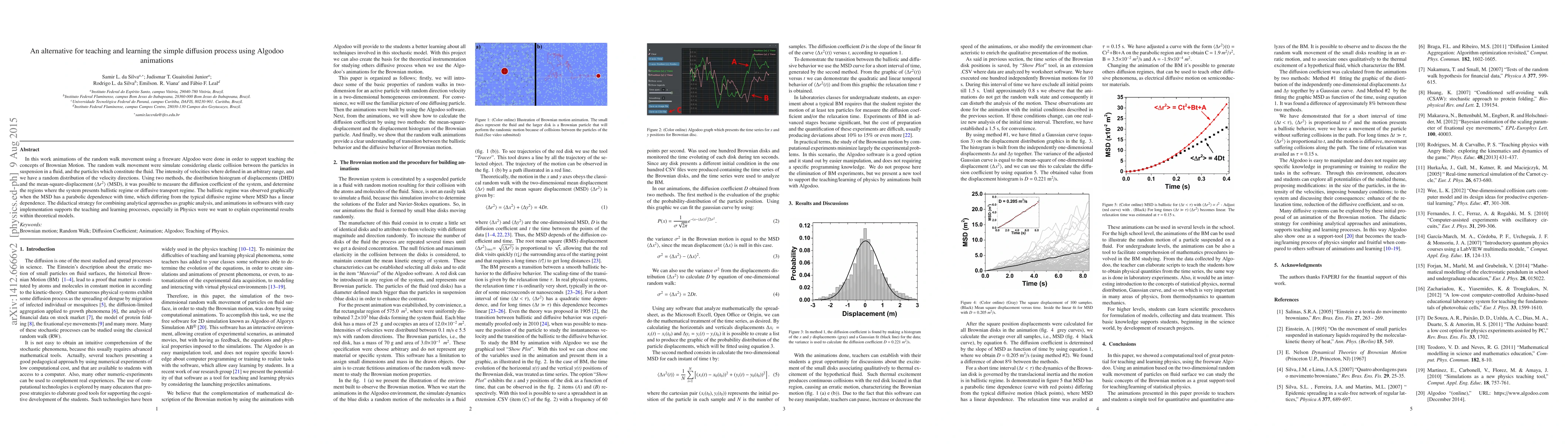 In this work animations of the random walk movement using a freeware Algodoo were done in order to support teaching the concepts of Brownian Motion. The random walk movement were simulate considering elastic collision between the particles in suspension in a fluid, and the particles which constitute the fluid. The intensity of velocities where defined in an arbitrary range, and we have a random distribution of the velocity directions. Using two methods, the distribution histogram of displacements (DHD) and the mean-square-displacement ${\langle{\Delta r^{2}}\rangle}$ (MSD), it was possible to measure the diffusion coefficient of the system, and determine the regions where the system presents ballistic regime or diffusive transport regime. The ballistic regime was observed graphically when the MSD has a parabolic dependence with time, which differing from the typical diffusive regime where MSD has a linear dependence. The didactical strategy for combining analytical approaches as graphic analysis, and animations in software's with easy implementation supports the teaching and learning processes, especially in Physics were we want to explain experimental results within theoretical models.