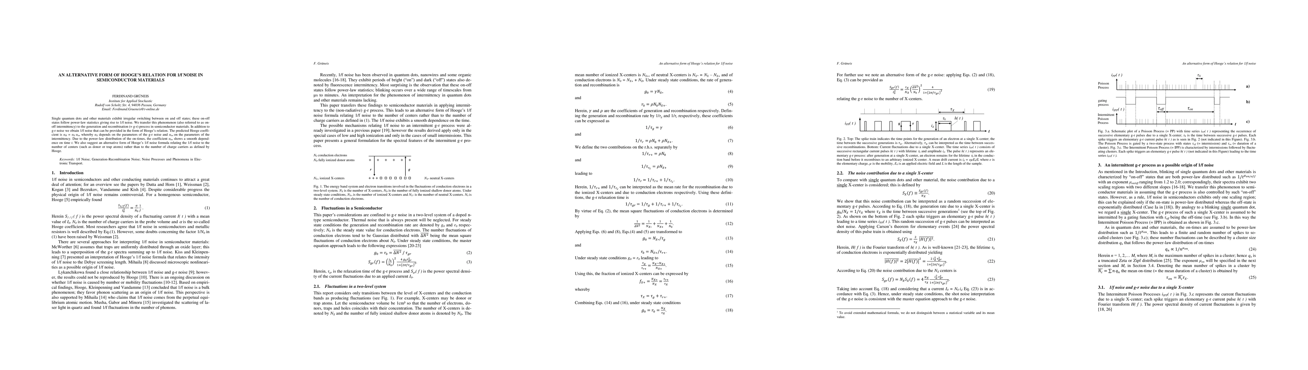 This paper proposes an alternative Hooge relation for 1/f noise in semiconductor materials, linking it to generation and recombination noise and intermittency phenomena. The new Hooge coefficient depends on both generation-recombination noise parameters and intermittency characteristics, and it correlates 1/f noise with the number of centers rather than charge carriers.