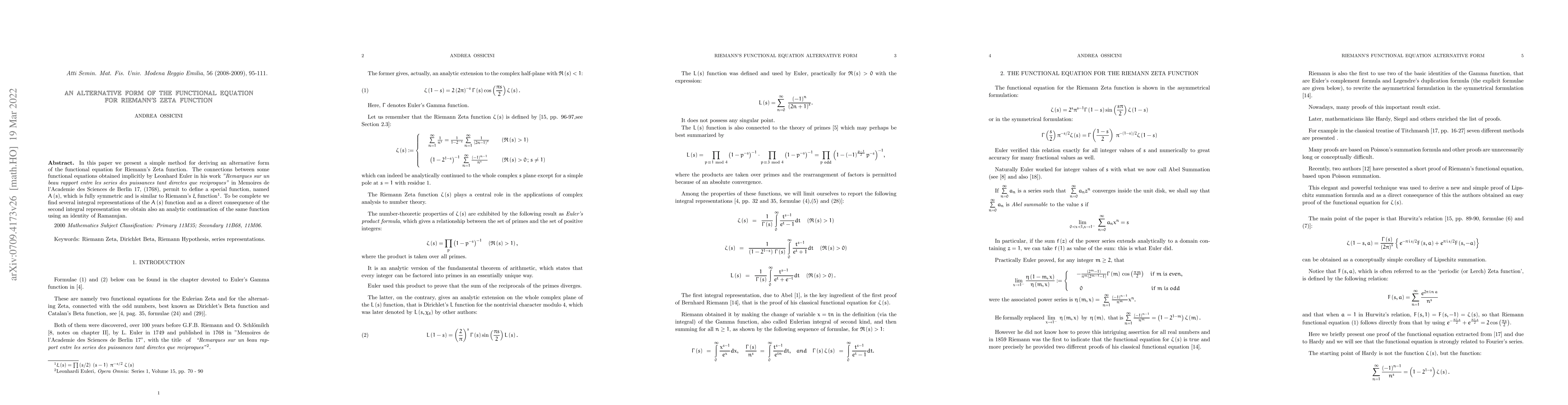 This paper introduces an alternative form of the functional equation for Riemann's Zeta function, deriving it through connections to Euler's work. It defines a new symmetric function, A(s), analogous to Riemann's "XI" function, and provides several integral representations and an analytic continuation using Ramanujan's identity.