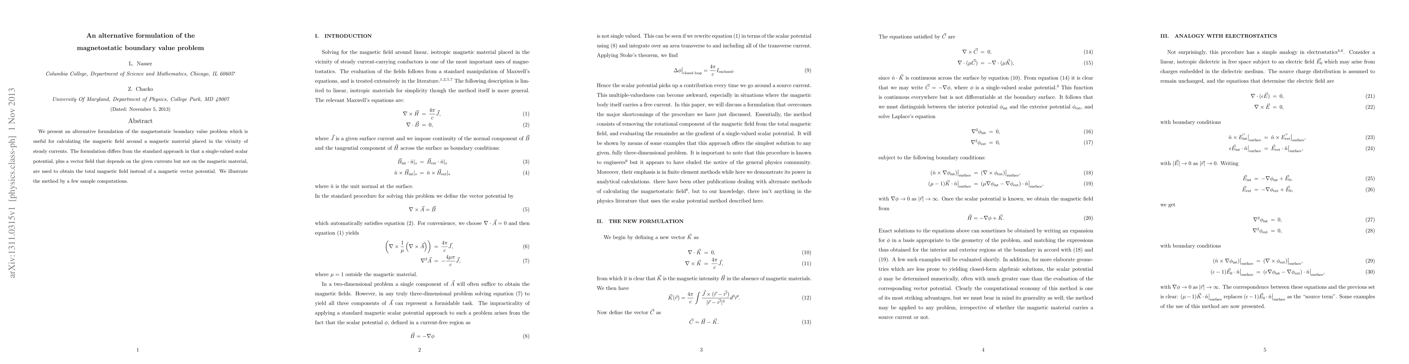 Researchers present an alternative method for calculating magnetic fields around magnetic materials in steady current environments, using a scalar potential and vector field instead of traditional vector potential.