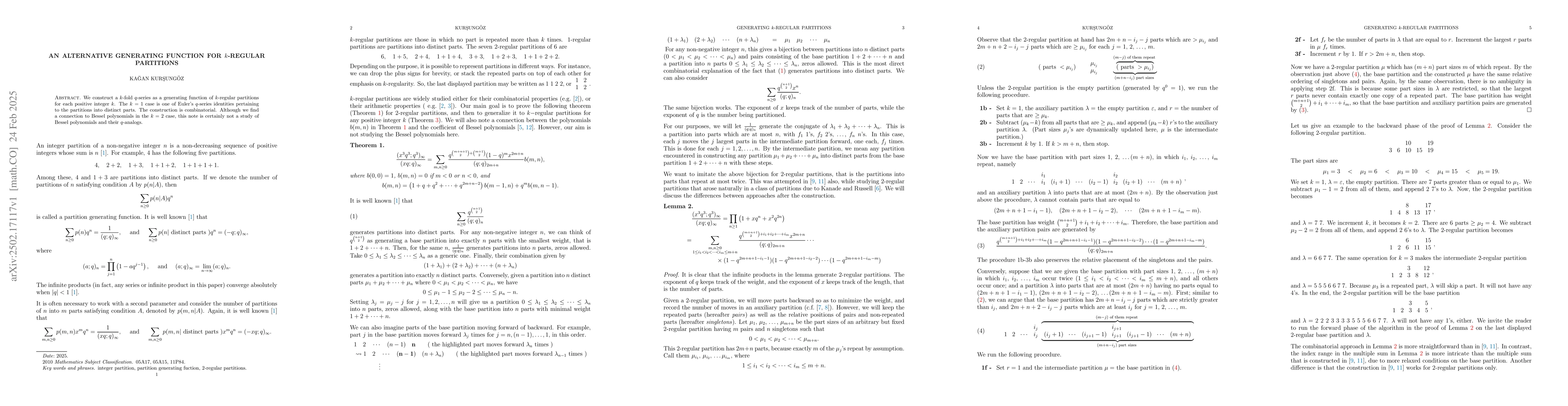 The paper introduces a novel combinatorial approach for generating k-regular partitions using a k-fold q-series, connecting it to Bessel polynomials in the k=2 case.