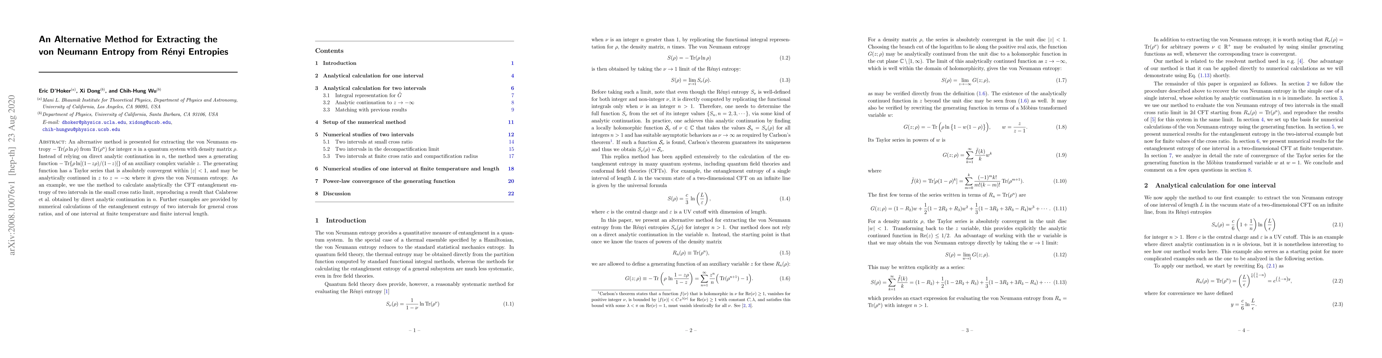 A new method for extracting von Neumann entropy from Renyi entropies uses a generating function with an auxiliary complex variable z, allowing for analytical continuation to negative infinity and reproducing known results in certain cases.
