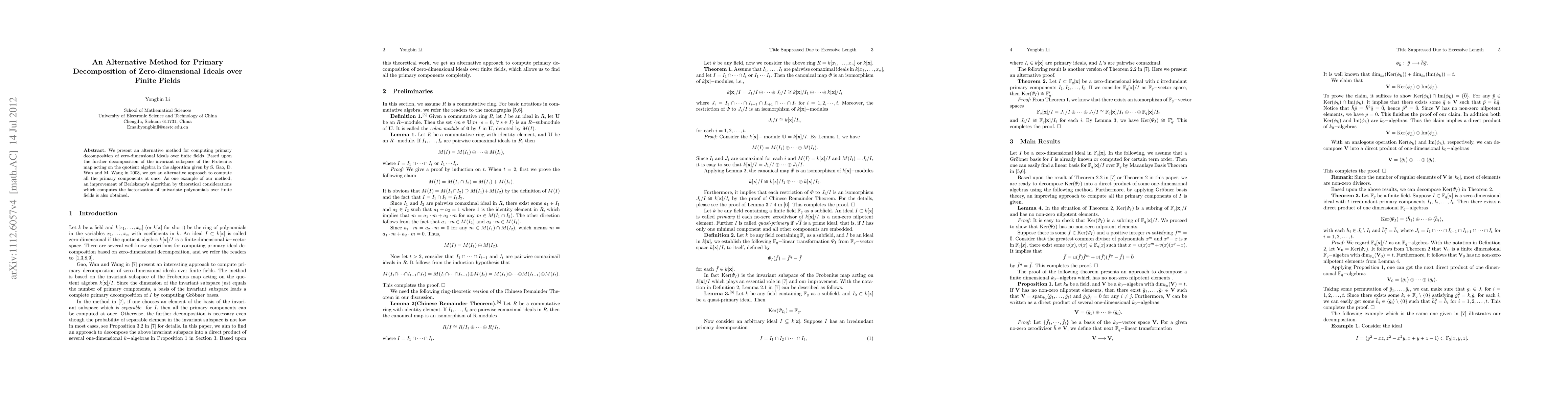 This paper introduces an alternative method for computing primary decomposition of zero-dimensional ideals over finite fields, leveraging the invariant subspace of the Frobenius map. This approach computes all primary components simultaneously, offering an improvement over Berlekamp's algorithm for factorizing univariate polynomials over finite fields.