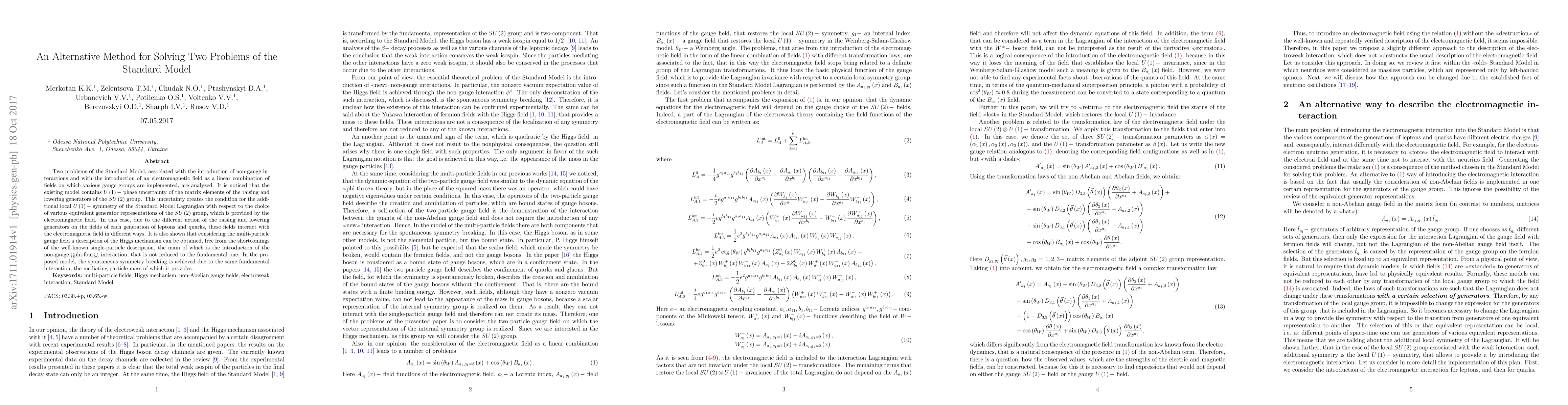 Two problems of the Standard Model, associated with the introduction of non-gauge interactions and with the introduction of an electromagnetic field as a linear combination of fields on which various gauge groups are implemented, are analyzed. It is noticed that the existing model contains $U\left( 1 \right)-$ phase uncertainty of the matrix elements of the raising and lowering generators of the $SU\left( 2 \right)$ group. This uncertainty creates the condition for the additional local $U\left( 1 \right)-$ symmetry of the Standard Model Lagrangian with respect to the choice of various equivalent generator representations of the $SU\left( 2 \right)$ group, which is provided by the electromagnetic field. In this case, due to the different action of the raising and lowering generators on the fields of each generation of leptons and quarks, these fields interact with the electromagnetic field in different ways. It is also shown that considering the multi-particle gauge field a description of the Higgs mechanism can be obtained, free from the shortcomings of the well-known single-particle description, the main of which is the introduction of the non-gauge "phi-four" interaction, that is not reduced to the fundamental one. In the proposed model, the spontaneous symmetry breaking is achieved due to the same fundamental interaction, the mediating particle mass of which it provides.