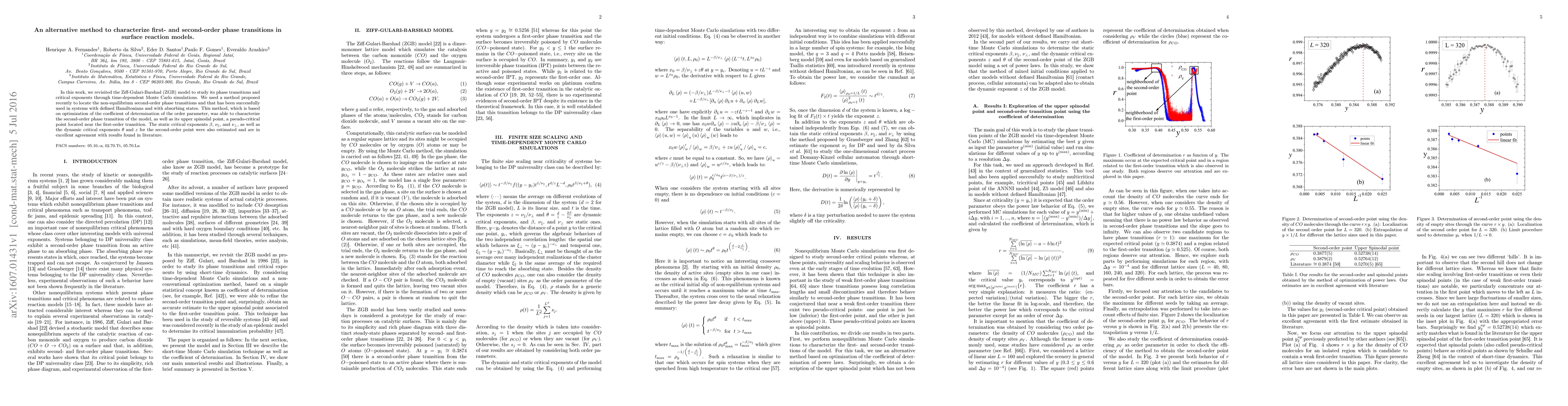 This paper revisits the Ziff-Gulari-Barshad (ZGB) model to study its phase transitions using Monte Carlo simulations. It employs a novel method to characterize non-equilibrium second-order phase transitions, successfully determining critical exponents and the upper spinodal point near the first-order transition, with results matching literature values.