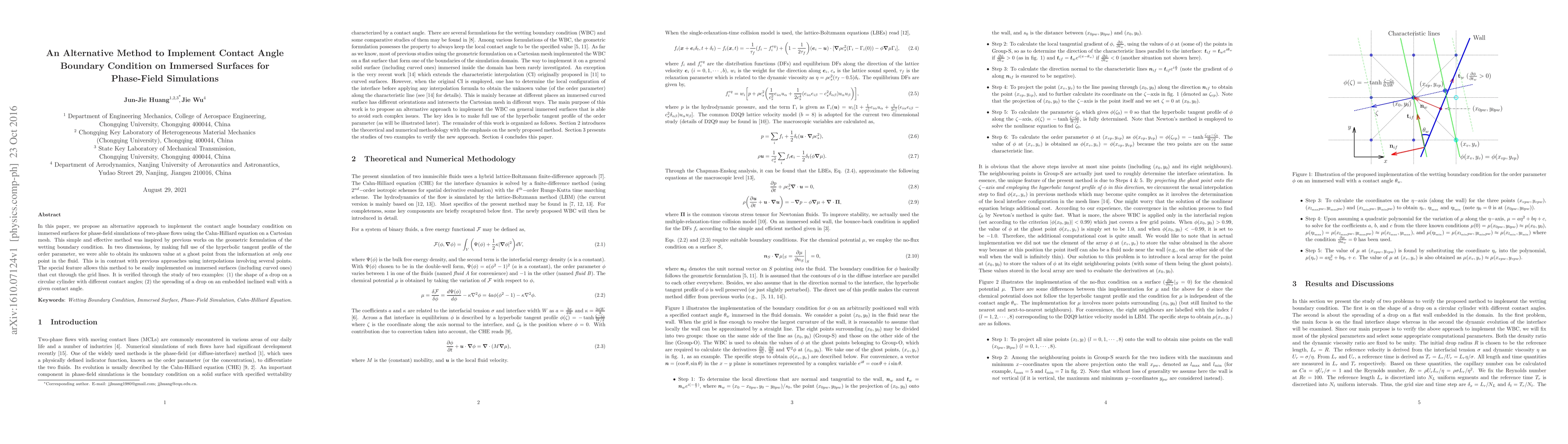 This paper presents an innovative method to apply contact angle boundary conditions on immersed surfaces in phase-field simulations of two-phase flows, using a hyperbolic tangent profile for efficient single-point determination of unknown values. The approach, verified through drop shape examples on cylinders and inclined walls, facilitates easy implementation on curved surfaces.