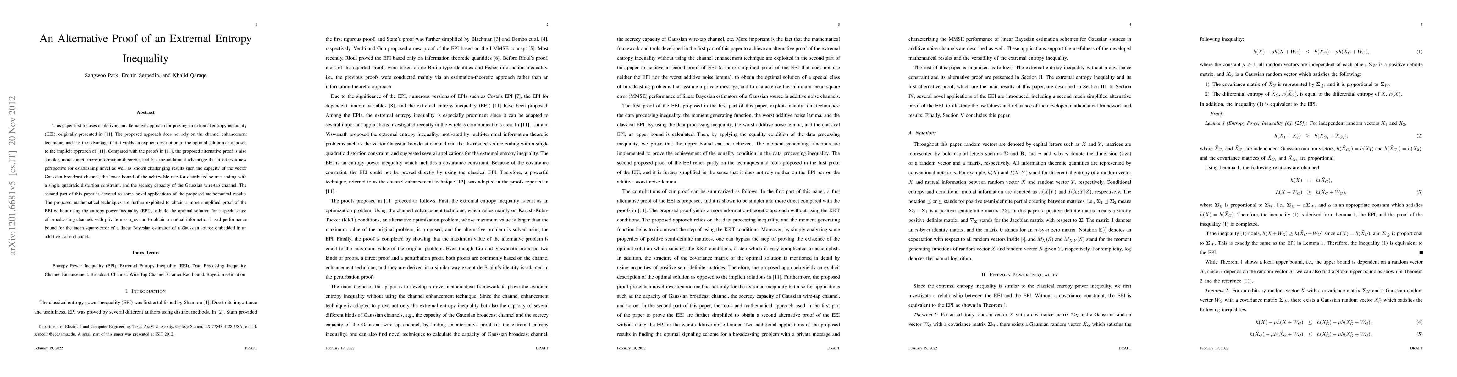 This paper presents an alternative, simpler proof for an extremal entropy inequality, providing an explicit optimal solution description. It also applies these techniques to simplify proofs for channel capacities, distributed source coding, and secrecy capacity, while deriving bounds for linear estimation in noise.
