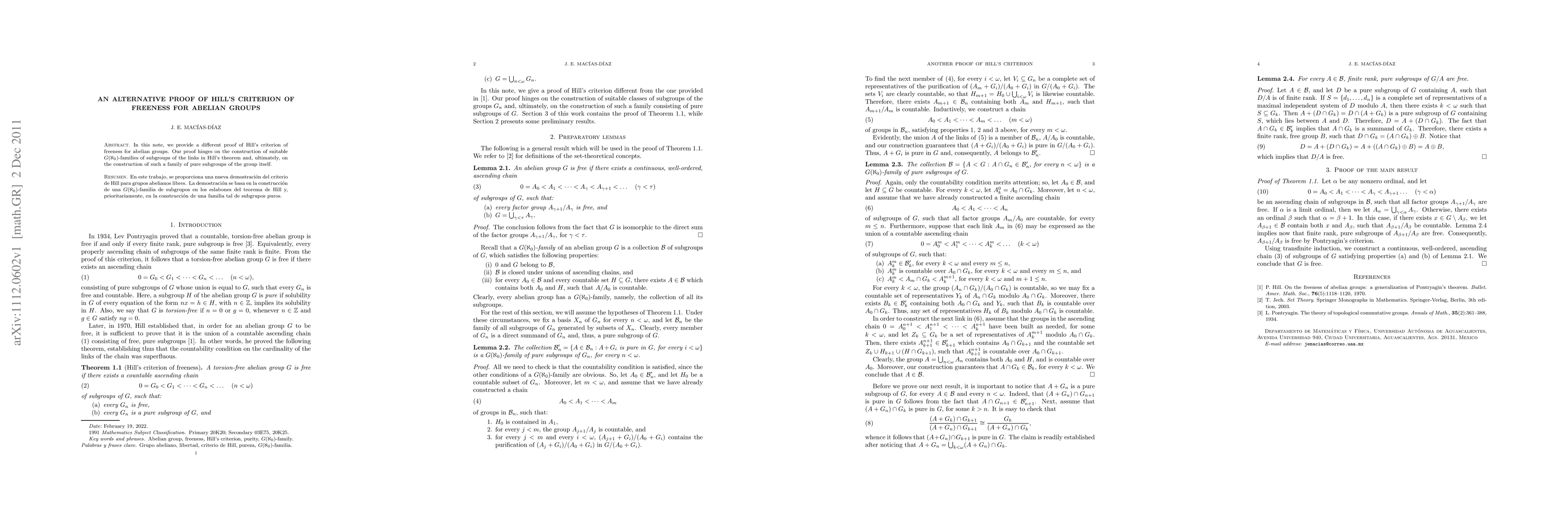 In this note, we provide a different proof of Hill's criterion of freeness for abelian groups. Our proof hinges on the construction of suitable families of subgroups of the links in Hill's theorem and, ultimately, on the construction of such a family of pure subgroups of the group itself.