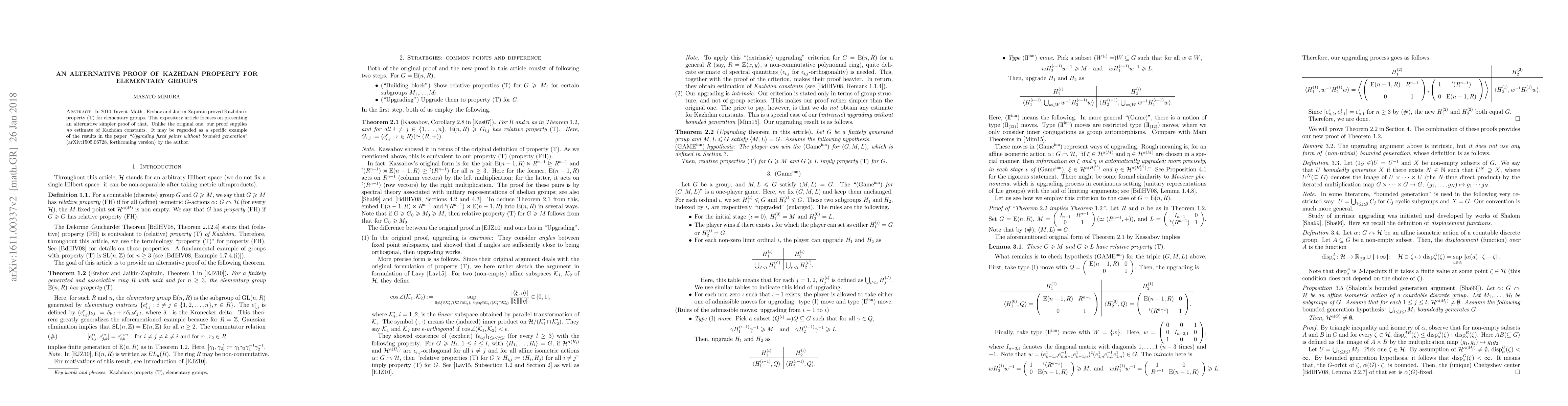 In 2010, Invent. Math., Ershov and Jaikin-Zapirain proved Kazhdan's property (T) for elementary groups. This expository article focuses on presenting an alternative simpler proof of that. Unlike the original one, our proof supplies no estimate of Kazhdan constants. It may be regarded as a specific example of the results in the paper "Upgrading fixed points without bounded generation" (arXiv:1505.06728, forthcoming version) by the author.