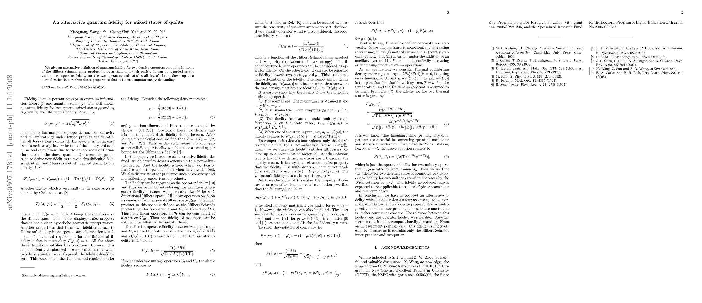 This paper proposes a new definition of quantum fidelity for mixed states of qudits using the Hilbert-Schmidt inner product and purity, which satisfies Jozsa's axioms and is computationally efficient. The alternative fidelity measure offers a practical approach to comparing quantum states.