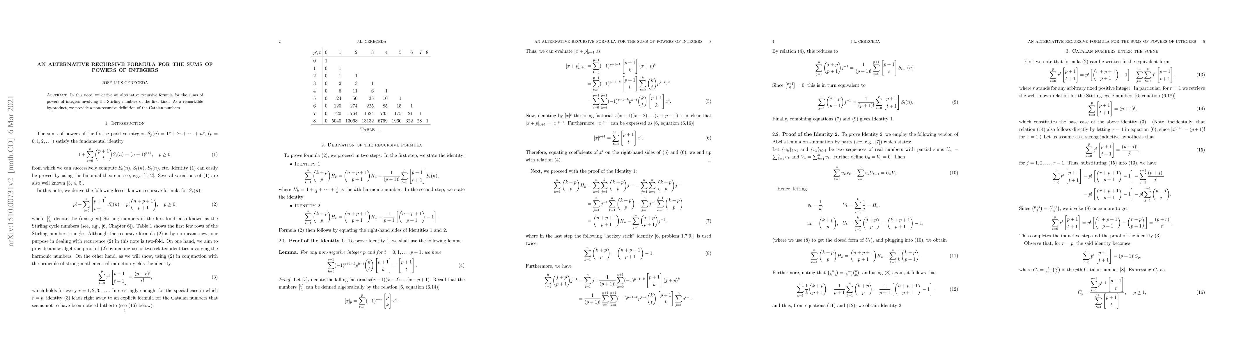 In this note, we derive an alternative recursive formula for the sums of powers of integers involving the Stirling numbers of the first kind. As a remarkable by-product, we provide a non-recursive definition of the Catalan numbers.