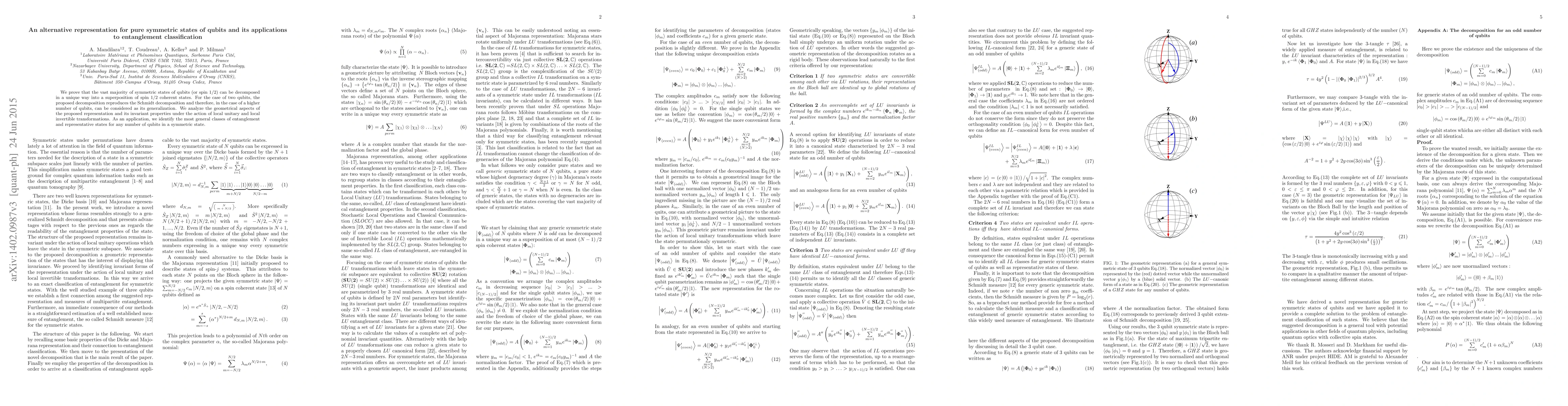 We prove that the vast majority of symmetric states of qubits can be decomposed in a unique way into a superposition of spin 1/2 coherent states. For the case of two qubits, the proposed decomposition reproduces the Schmidt decomposition and therefore, in the case of a higher number of qubits, can be considered as its generalization. We analyze the geometrical aspects of the proposed representation and its invariant properties under the action of local unitary and local invertible transformations. As an application, we identify the most general classes of entanglement and representative states for any number of qubits in a symmetric state.
