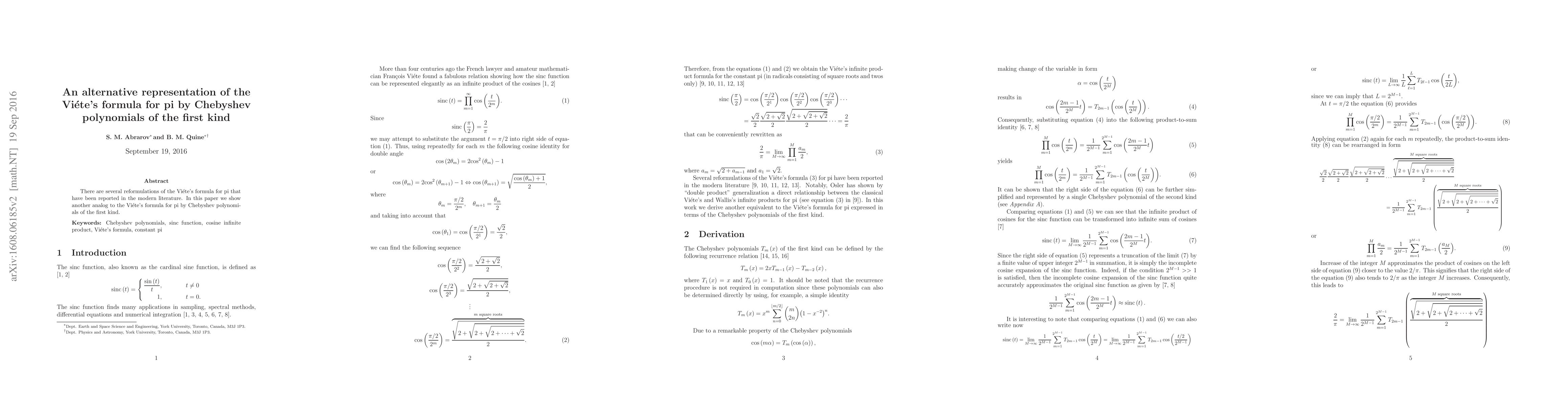 This paper presents an alternative representation of Viète's formula for π using Chebyshev polynomials of the first kind, offering a new perspective on the classical formula. The study contributes to the modern literature on reformulations of π through polynomial approximations.