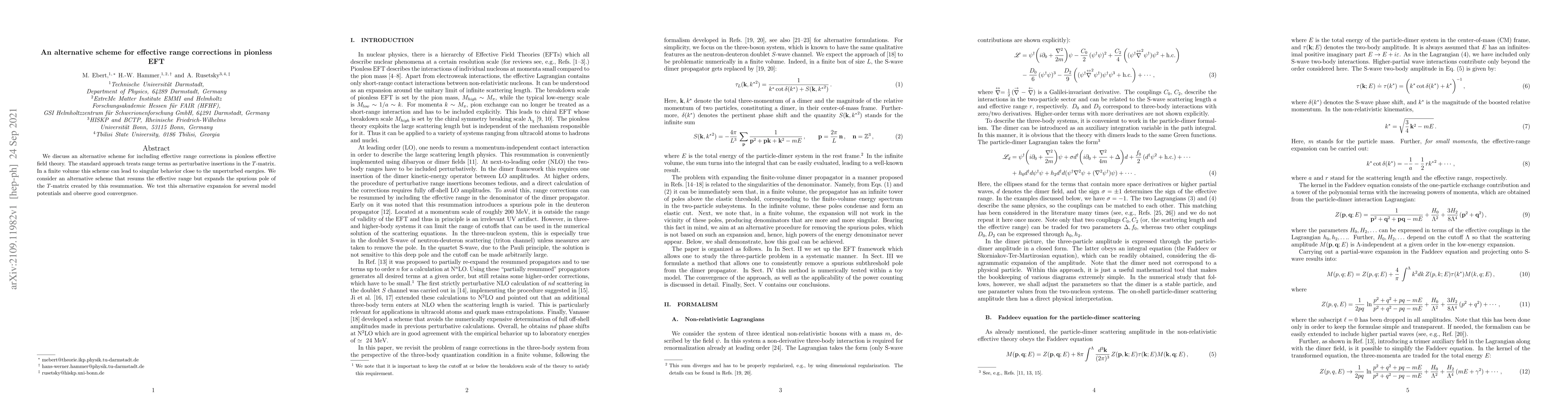 Researchers propose an alternative method for correcting range effects in pionless EFT, which resums effective range terms while expanding a spurious pole in the T-matrix, showing good convergence across several model potentials.
