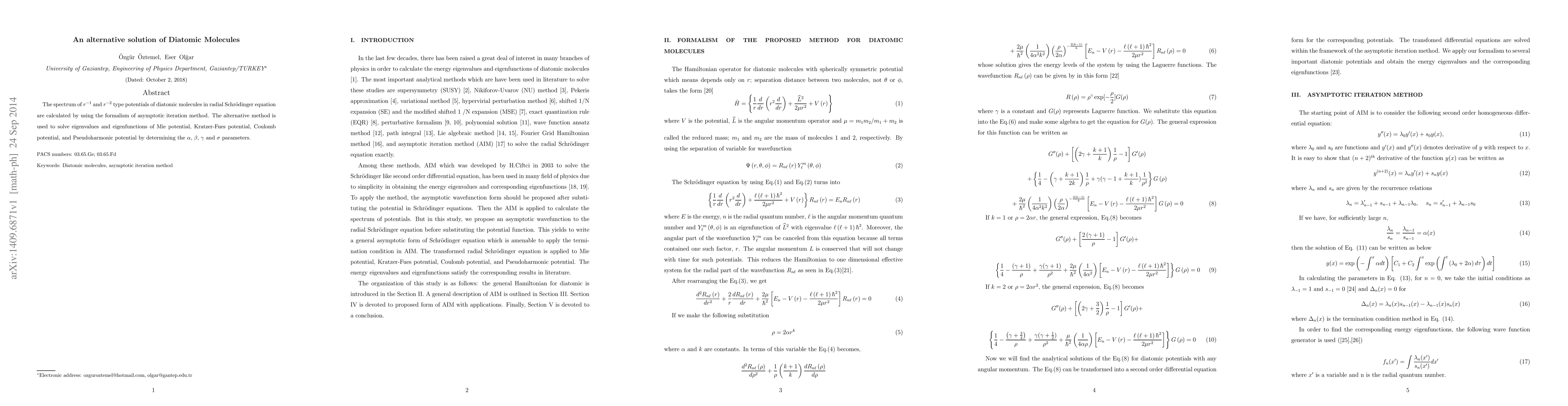 This paper proposes an alternative solution for the spectrum of diatomic molecules using the asymptotic iteration method to solve the radial Schrödinger equation for r-1 and r-2 type potentials, including Mie, Kratzer-Fues, Coulomb, and Pseudoharmonic potentials, by determining specific parameters.