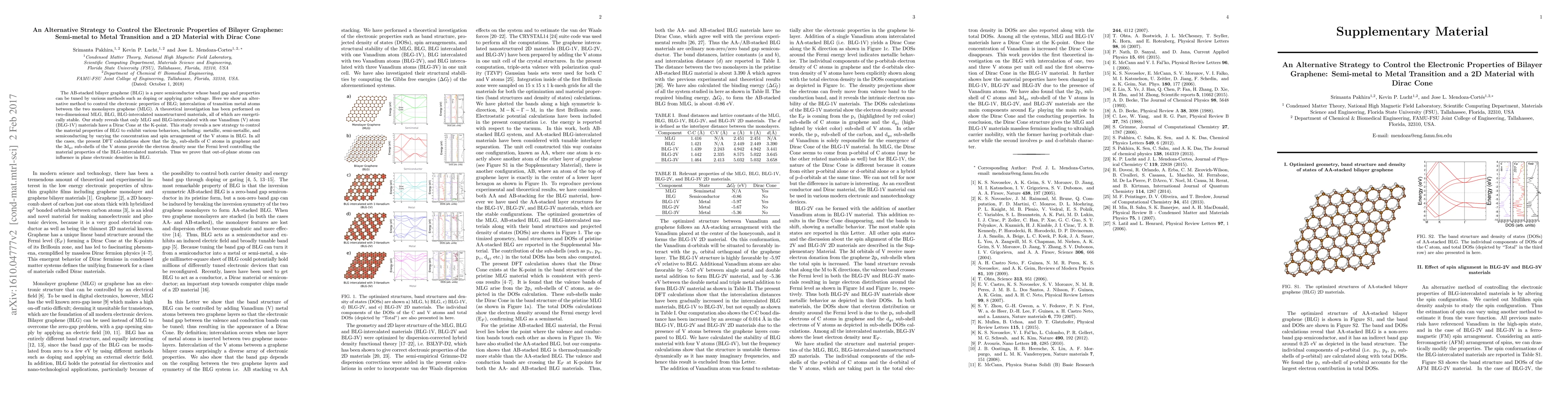 This paper proposes intercalating transition metal atoms, specifically Vanadium, between bilayer graphene layers to control its electronic properties, achieving a semi-metal to metal transition and a Dirac Cone. Density functional theory calculations show that varying the concentration and spin arrangement of V atoms can modulate BLG's electronic behavior.