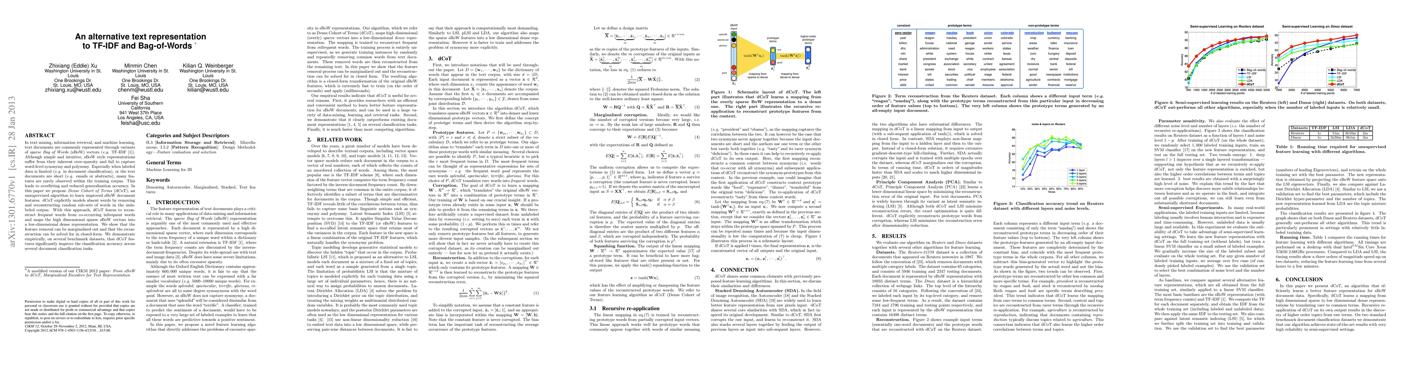 In text mining, information retrieval, and machine learning, text documents are commonly represented through variants of sparse Bag of Words (sBoW) vectors (e.g. TF-IDF). Although simple and intuitive, sBoW style representations suffer from their inherent over-sparsity and fail to capture word-level synonymy and polysemy. Especially when labeled data is limited (e.g. in document classification), or the text documents are short (e.g. emails or abstracts), many features are rarely observed within the training corpus. This leads to overfitting and reduced generalization accuracy. In this paper we propose Dense Cohort of Terms (dCoT), an unsupervised algorithm to learn improved sBoW document features. dCoT explicitly models absent words by removing and reconstructing random sub-sets of words in the unlabeled corpus. With this approach, dCoT learns to reconstruct frequent words from co-occurring infrequent words and maps the high dimensional sparse sBoW vectors into a low-dimensional dense representation. We show that the feature removal can be marginalized out and that the reconstruction can be solved for in closed-form. We demonstrate empirically, on several benchmark datasets, that dCoT features significantly improve the classification accuracy across several document classification tasks.