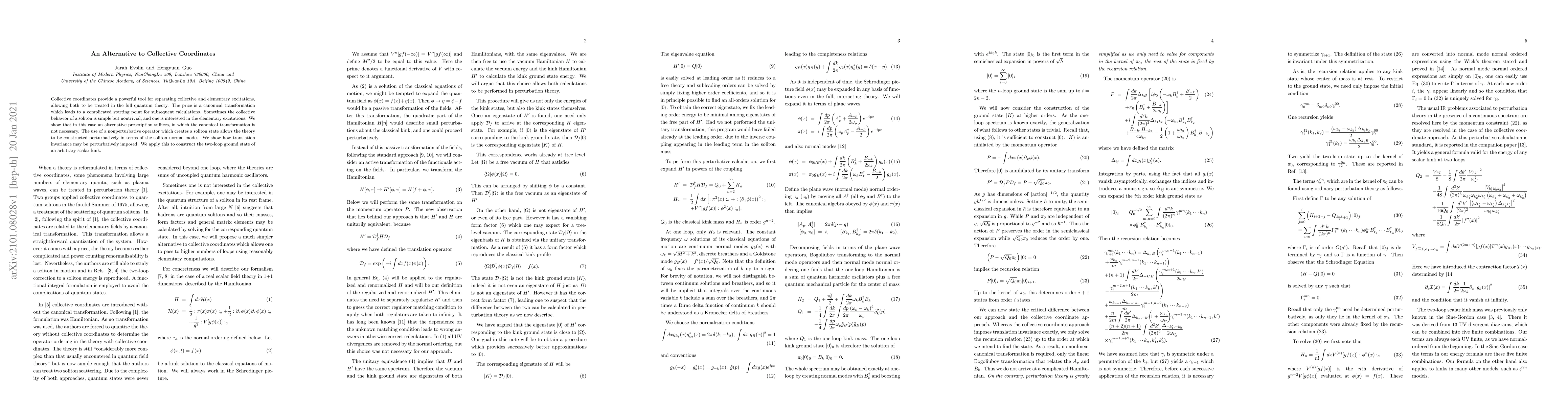 Researchers developed an alternative method to analyze collective behavior in solitons without requiring a canonical transformation, allowing for simpler calculations and construction of the two-loop ground state of scalar kinks.