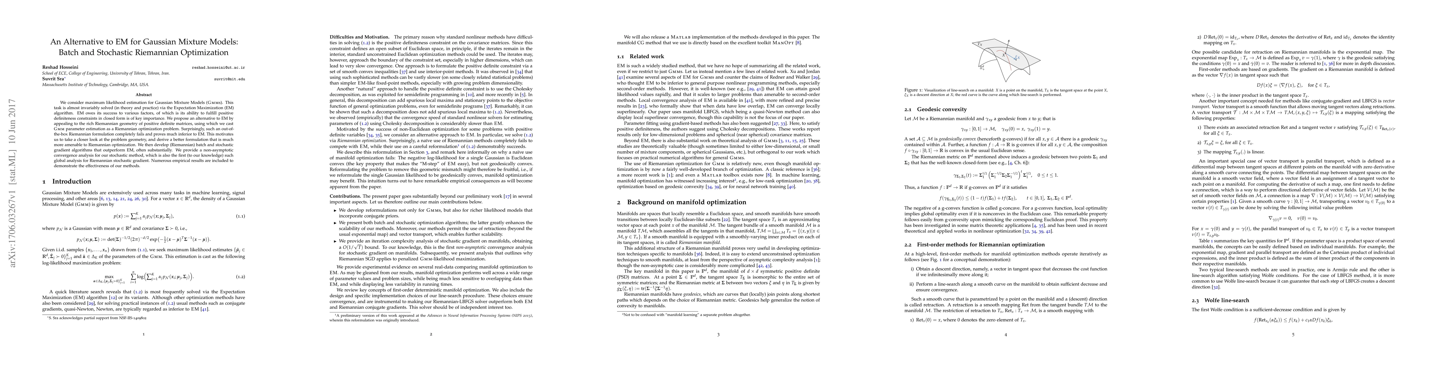 This paper proposes alternative Riemannian optimization methods to the Expectation Maximization (EM) algorithm for Gaussian Mixture Models (GMMs). Despite initial failures, the authors refine the Riemannian formulation and develop batch and stochastic gradient algorithms that outperform EM, supported by non-asymptotic convergence analysis and empirical results.