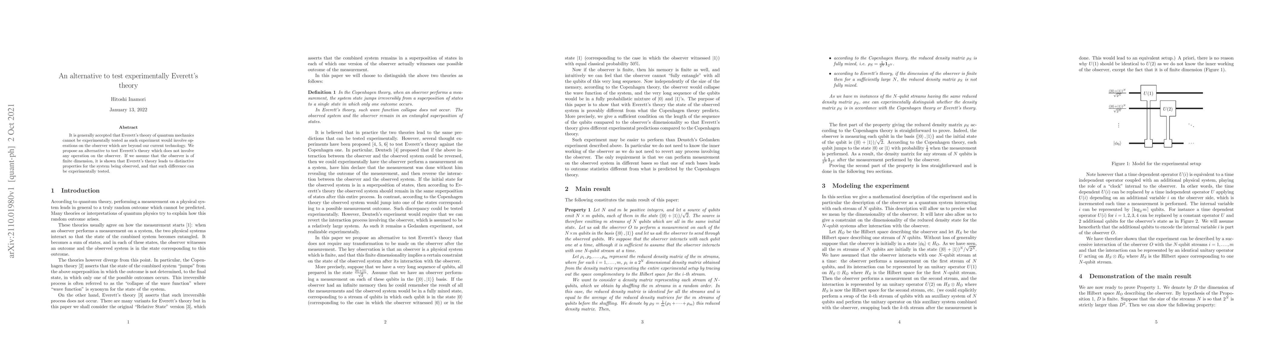 This paper proposes an alternative method to test Everett's theory of quantum mechanics, which traditionally cannot be experimentally verified due to technological limitations. It suggests that by assuming the observer has finite dimensions, distinct properties can be identified for observed systems, allowing for experimental verification without altering the observer.