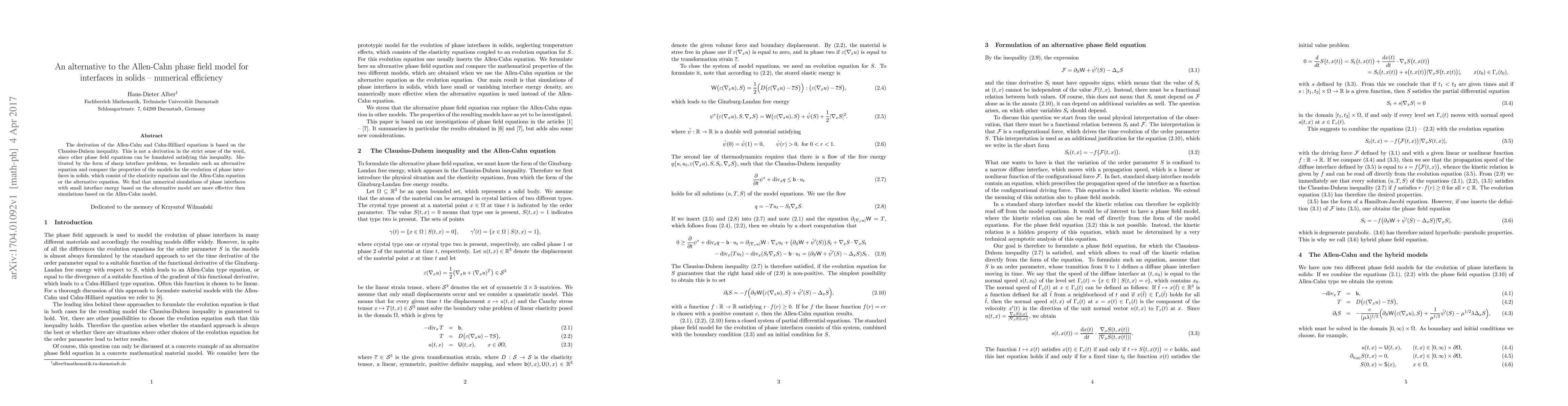 This paper proposes an alternative phase field model to the Allen-Cahn model for simulating phase interfaces in solids, demonstrating that it is more numerically efficient for small interface energies. The new model is derived from the Clausius-Duhem inequality and shows superior performance in computational simulations.