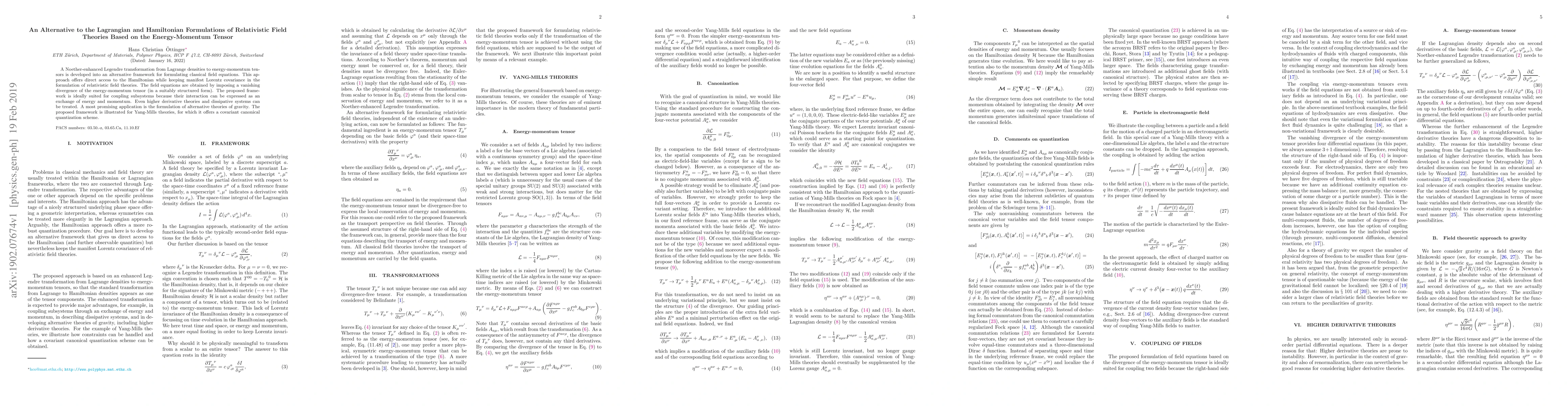A Noether-enhanced Legendre transformation from Lagrange densities to energy-momentum tensors is developed into an alternative framework for formulating classical field equations. This approach offers direct access to the Hamiltonian while keeping manifest Lorentz covariance in the formulation of relativistic field theories. The field equations are obtained by imposing a vanishing divergence of the energy-momentum tensor (in a suitably structured form). The proposed framework is ideally suited for coupling subsystems because their interaction can be expressed as an exchange of energy and momentum. Even higher derivative theories and dissipative systems can be treated. A most promising application is the formulation of alternative theories of gravity. The proposed framework is illustrated for Yang-Mills theories, for which it offers a covariant canonical quantization scheme.