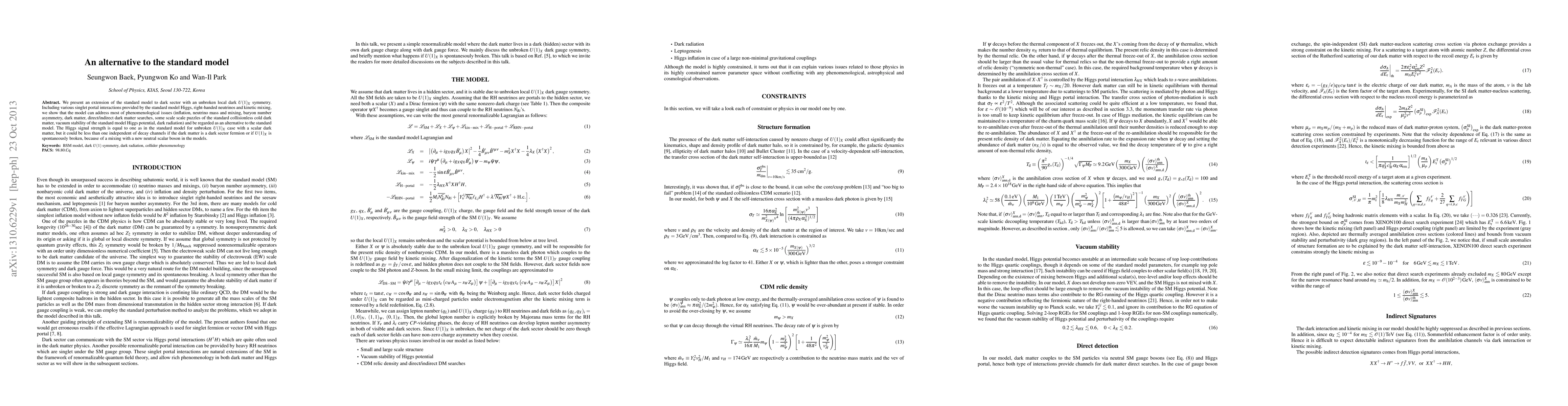 We present an extension of the standard model to dark sector with an unbroken local dark $U(1)_X$ symmetry. Including various singlet portal interactions provided by the standard model Higgs, right-handed neutrinos and kinetic mixing, we show that the model can address most of phenomenological issues (inflation, neutrino mass and mixing, baryon number asymmetry, dark matter, direct/indirect dark matter searches, some scale scale puzzles of the standard collisionless cold dark matter, vacuum stability of the standard model Higgs potential, dark radiation) and be regarded as an alternative to the standard model. The Higgs signal strength is equal to one as in the standard model for unbroken $U(1)_X$ case with a scalar dark matter, but it could be less than one independent of decay channels if the dark matter is a dark sector fermion or if $U(1)_X$ is spontaneously broken, because of a mixing with a new neutral scalar boson in the models.