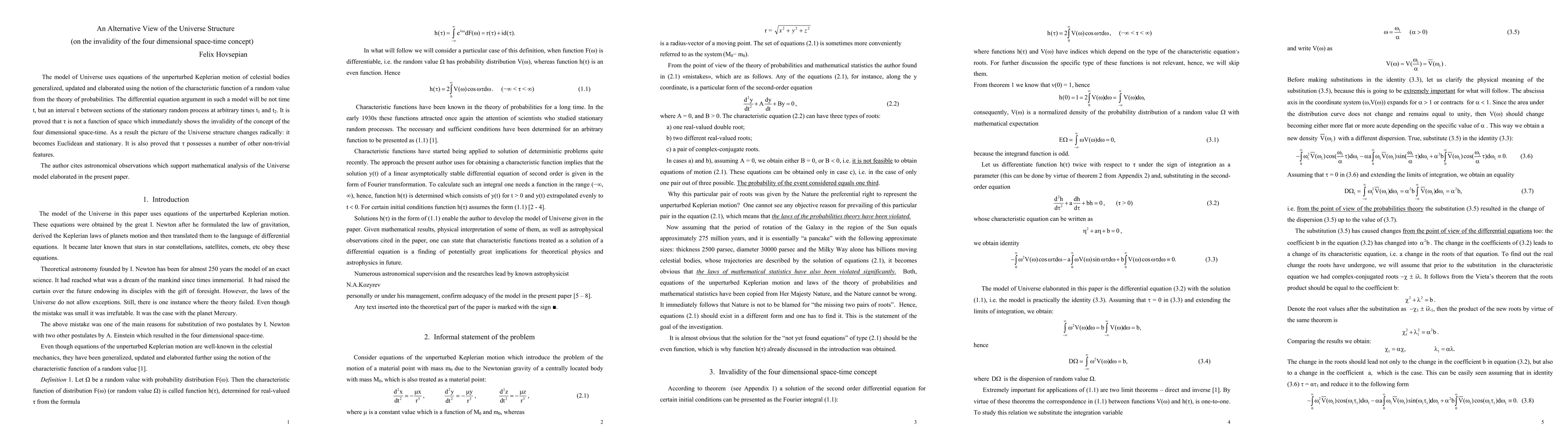 The model of the Universe in this paper uses equations of the unperturbed Keplerian motion. They have been updated, complementied and generalized when the solution of these equations is the characteristic function of a random value from the theory of probabilities. Argument of the differential equation in this case is any more time, an interval of time between sections of a random stationary prosess. In this paper this time interval is referred to as flexible (elastic) time due to its many non-trivial properties. It is proved flexible time does not depend on the space which makes invalid the four dimensional space-time concept. The Universe becomes stationary and Eucledian. It is proved: 1. the advavce of Mercury's perihelion versus the predictions in accordance with the universal gravity law results inequality of the coefficients in the correlation equations of Keplerian moution along axes x, y and z; 2. the velocity of propagation of harmonic oscillation in the Uneverse is not constant; 3. long-range interaction, i.e. instantaneous communication between any two points of space in tne Universe is possible; 4. the Universe is a closed-loop informatiom-energy system which revives the nature and acts as a barrier to the second law of thermodynamics where stars are treated as machines which accumulate energy by moving. Physics in the Universe is conceptually different from that of the Earth and, respectively, needs methods of investigation different from the ones which are used today. Numerous astronomical supervision and the researches lead by known astrophysicist N.A.Kozyrev personally or under his management confirm adequacy of the model in the present paper.