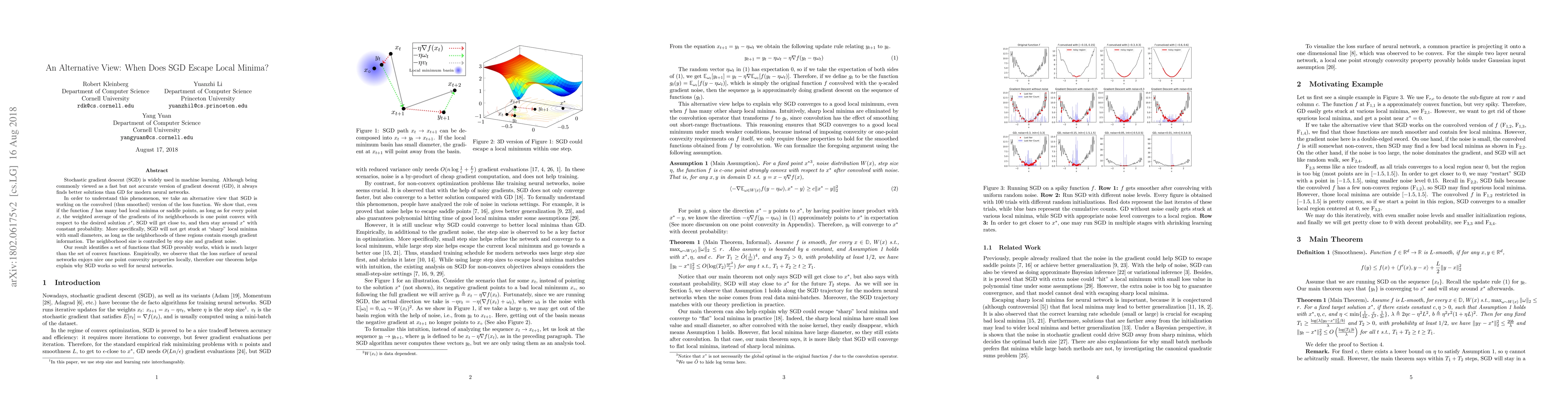This paper proposes that SGD escapes local minima in neural networks by working on a smoothed version of the loss function, showing that SGD can find better solutions than GD due to its ability to navigate through "sharp" local minima when gradient information is sufficiently available in the neighborhood. This one-point convexity property is empirically observed in neural networks, explaining SGD's effectiveness.
