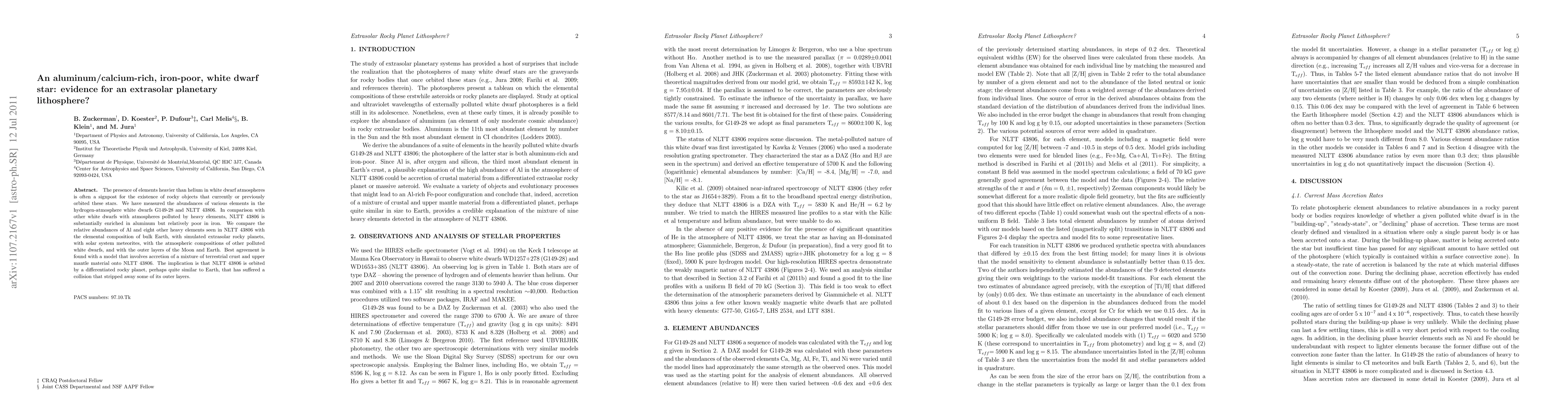 The presence of elements heavier than helium in white dwarf atmospheres is often a signpost for the existence of rocky objects that currently or previously orbited these stars. We have measured the abundances of various elements in the hydrogen-atmosphere white dwarfs G149-28 and NLTT 43806. In comparison with other white dwarfs with atmospheres polluted by heavy elements, NLTT 43806 is substantially enriched in aluminum but relatively poor in iron. We compare the relative abundances of Al and eight other heavy elements seen in NLTT 43806 with the elemental composition of bulk Earth, with simulated extrasolar rocky planets, with solar system meteorites, with the atmospheric compositions of other polluted white dwarfs, and with the outer layers of the Moon and Earth. Best agreement is found with a model that involves accretion of a mixture of terrestrial crust and upper mantle material onto NLTT 43806. The implication is that NLTT 43806 is orbited by a differentiated rocky planet, perhaps quite similar to Earth, that has suffered a collision that stripped away some of its outer layers.