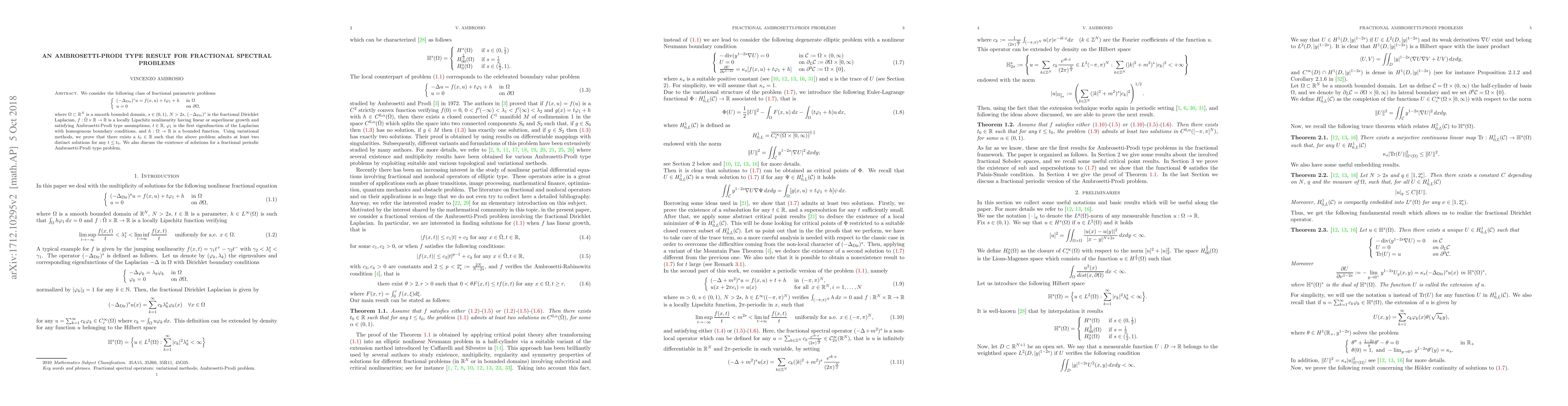 We consider the following class of fractional parametric problems \begin{equation*} \left\{ \begin{array}{ll} (-\Delta_{Dir})^{s} u= f(x, u)+t\varphi_{1}+h &\mbox{ in } \Omega\\ u=0 &\mbox{ on } \partial \Omega, \end{array} \right. \end{equation*} where $\Omega\subset \mathbb{R}^{N}$ is a smooth bounded domain, $s\in (0, 1)$, $N> 2s$, $(-\Delta_{Dir})^{s}$ is the fractional Dirichlet Laplacian, $f: \bar{\Omega} \times \mathbb{R} \rightarrow \mathbb{R}$ is a locally Lipschitz nonlinearity having linear or superlinear growth and satisfying Ambrosetti-Prodi type assumptions, $t\in \mathbb{R}$, $\varphi_{1}$ is the first eigenfunction of the Laplacian with homogenous boundary conditions, and $h:\Omega\rightarrow \mathbb{R}$ is a bounded function. Using variational methods, we prove that there exists a $t_{0}\in \mathbb{R}$ such that the above problem admits at least two distinct solutions for any $t\leq t_{0}$. We also discuss the existence of solutions for a fractional periodic Ambrosetti-Prodi type problem.