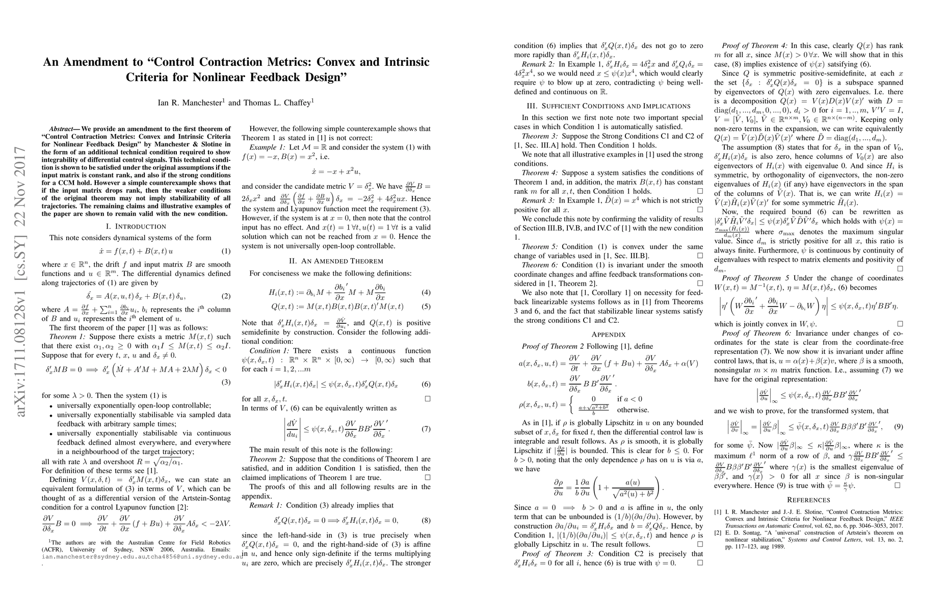 This paper amends the first theorem of a prior work on nonlinear feedback design by introducing a new technical condition for the integrability of differential control signals, which is satisfied under constant rank input matrices or strong conditions for a Control Contraction Metric. It demonstrates that without this condition, the original theorem's weaker assumptions may fail to ensure stabilizability.