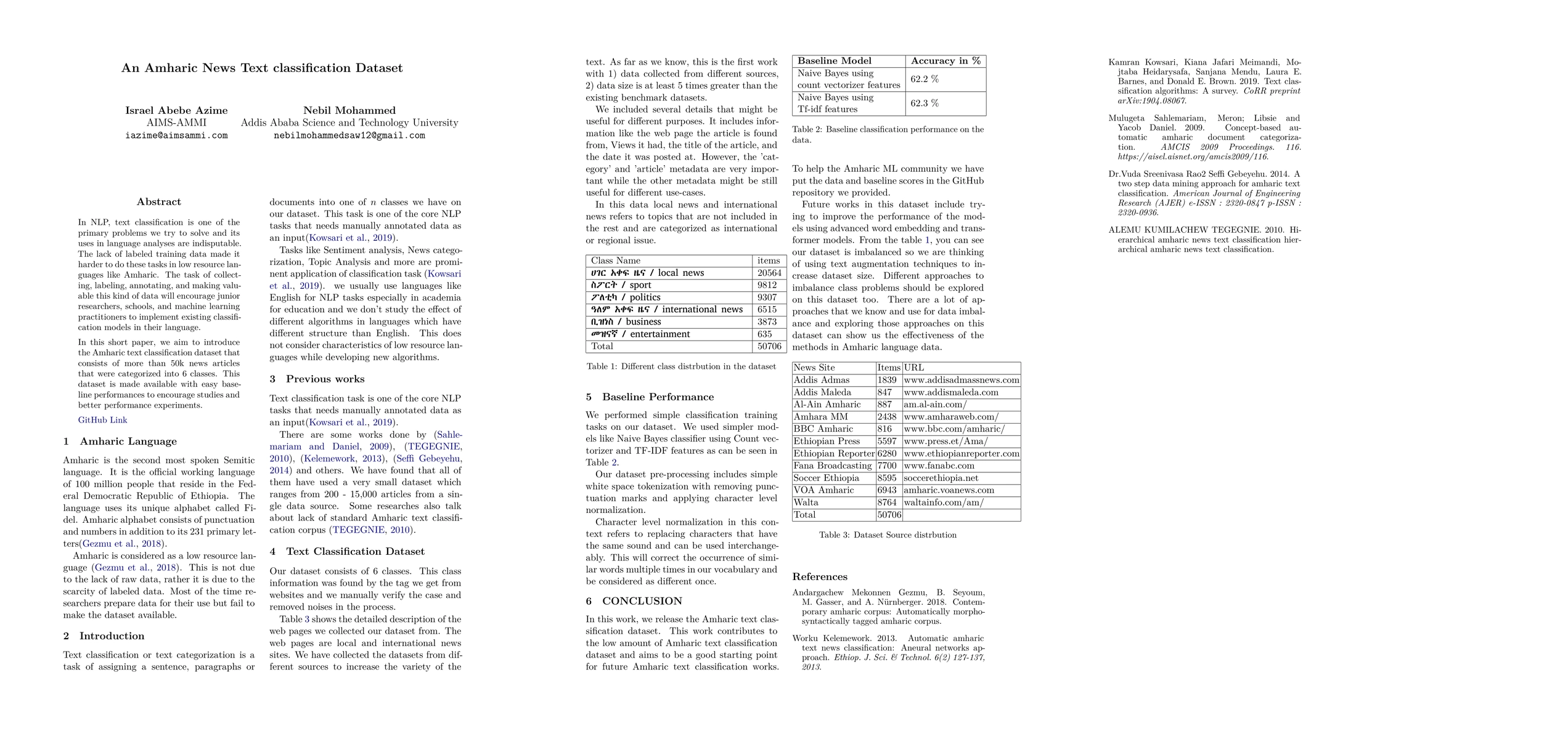 In NLP, text classification is one of the primary problems we try to solve and its uses in language analyses are indisputable. The lack of labeled training data made it harder to do these tasks in low resource languages like Amharic. The task of collecting, labeling, annotating, and making valuable this kind of data will encourage junior researchers, schools, and machine learning practitioners to implement existing classification models in their language. In this short paper, we aim to introduce the Amharic text classification dataset that consists of more than 50k news articles that were categorized into 6 classes. This dataset is made available with easy baseline performances to encourage studies and better performance experiments.