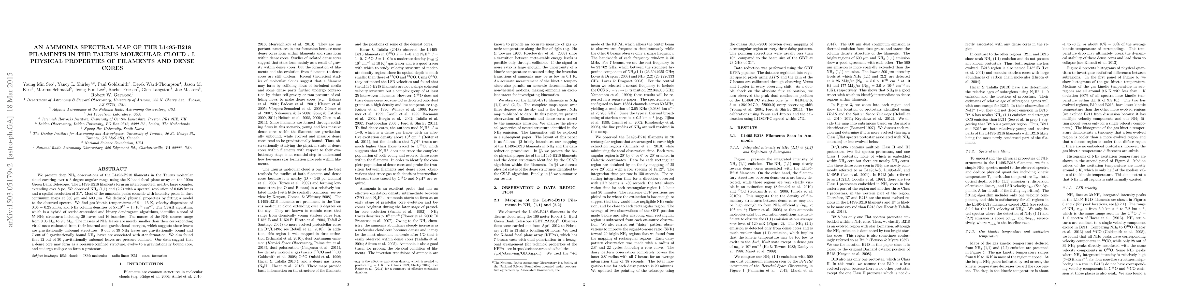 We present deep NH$_3$ observations of the L1495-B218 filaments in the Taurus molecular cloud covering over a 3 degree angular range using the K-band focal plane array on the 100m Green Bank Telescope. The L1495-B218 filaments form an interconnected, nearby, large complex extending over 8 pc. We observed NH$_3$ (1,1) and (2,2) with a spectral resolution of 0.038 km/s and a spatial resolution of 31$"$. Most of the ammonia peaks coincide with intensity peaks in dust continuum maps at 350 $\mu$m and 500 $\mu$m. We deduced physical properties by fitting a model to the observed spectra. We find gas kinetic temperatures of 8 $-$ 15 K, velocity dispersions of 0.05 $-$ 0.25 km/s, and NH$_3$ column densities of 5$\times$10$^{12}$ $-$ 1$\times$10$^{14}$ cm$^{-2}$. The CSAR algorithm, which is a hybrid of seeded-watershed and binary dendrogram algorithms, identifies a total of 55 NH$_3$ structures including 39 leaves and 16 branches. The masses of the NH$_3$ sources range from 0.05 M$_\odot$ to 9.5 M$_\odot$. The masses of NH$_3$ leaves are mostly smaller than their corresponding virial mass estimated from their internal and gravitational energies, which suggests these leaves are gravitationally unbound structures. 9 out of 39 NH$_3$ leaves are gravitationally bound and 7 out of 9 gravitationally bound NH$_3$ leaves are associated with star formation. We also found that 12 out of 30 gravitationally unbound leaves are pressure-confined. Our data suggest that a dense core may form as a pressure-confined structure, evolve to a gravitationally bound core, and undergo collapse to form a protostar.