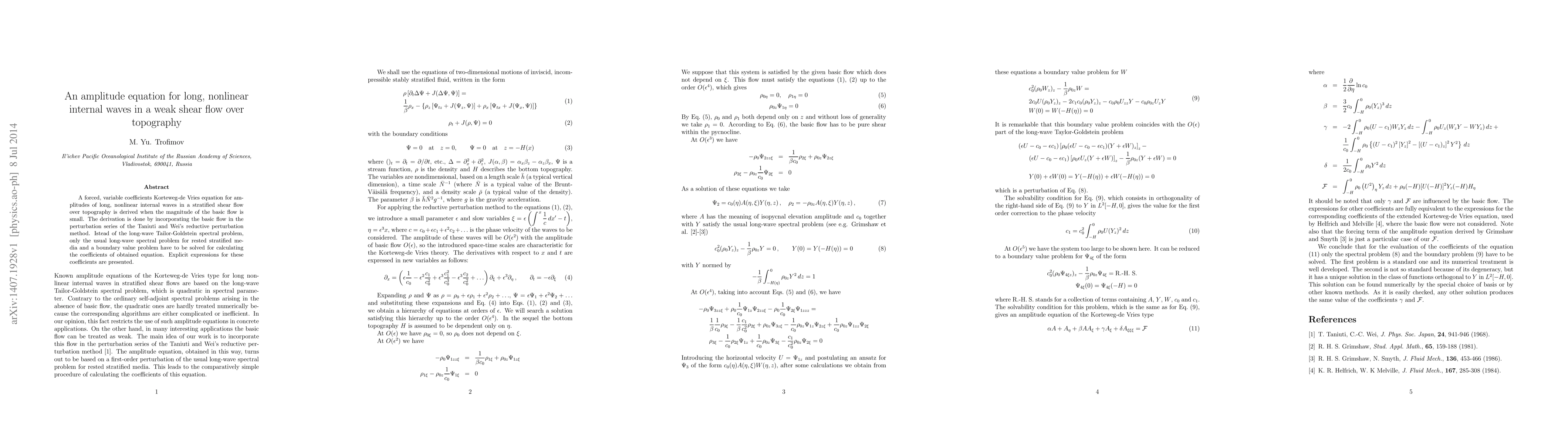 This paper derives an amplitude equation for long, nonlinear internal waves in a stratified shear flow over topography, using a forced, variable coefficients Korteweg-de Vries equation. The derivation employs the Taniuti and Wei's reductive perturbation method, simplifying the problem by focusing on the long-wave spectral problem and a boundary value problem instead of the complex Tailor-Goldstein spectral problem.