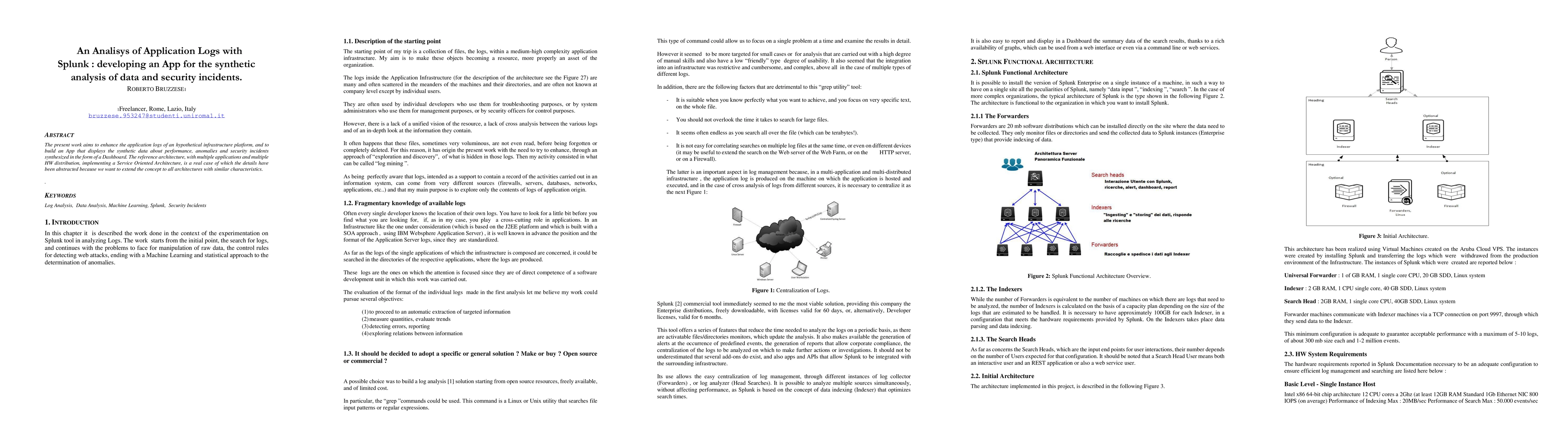 This paper develops a Splunk App for synthetic analysis of application logs, focusing on performance, anomalies, and security incidents, and presents a dashboard for visualizing this data. The study aims to generalize the approach to various architectures with similar characteristics.