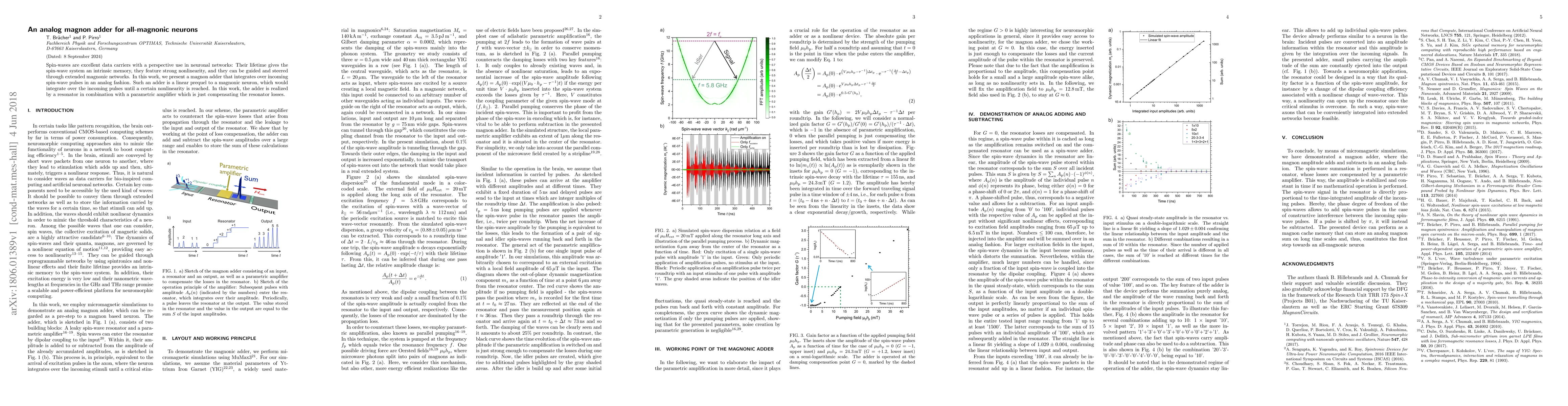 This research introduces an analog magnon adder utilizing spin-waves as data carriers in magnonic networks, employing a resonator and parametric amplifier to integrate incoming spin-wave pulses. This adder serves as a foundational component for developing all-magnonic neurons.