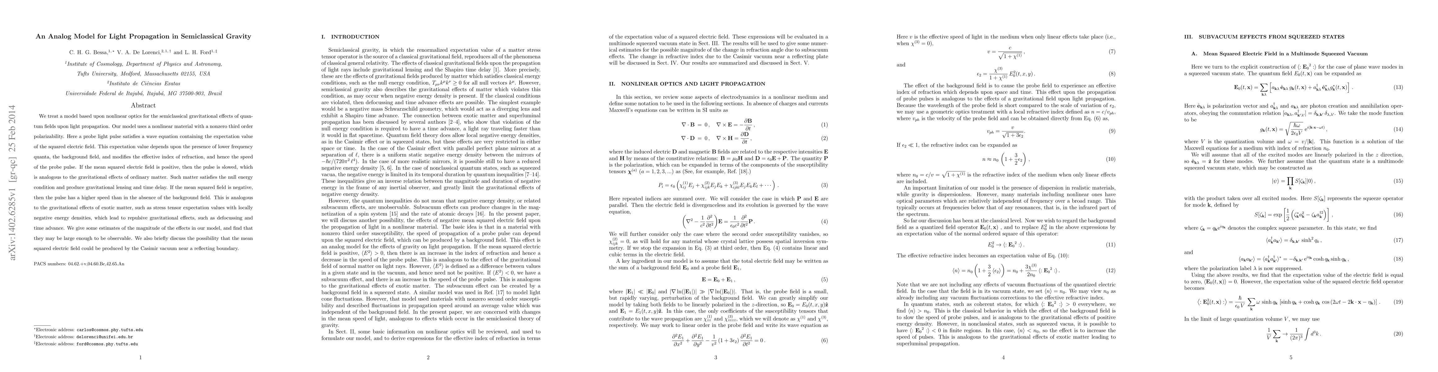 We treat a model based upon nonlinear optics for the semiclassical gravitational effects of quantum fields upon light propagation. Our model uses a nonlinear material with a nonzero third order polarizability. Here a probe light pulse satisfies a wave equation containing the expectation value of the squared electric field. This expectation value depends upon the presence of lower frequency quanta, the background field, and modifies the effective index of refraction, and hence the speed of the probe pulse. If the mean squared electric field is positive, then the pulse is slowed, which is analogous to the gravitational effects of ordinary matter. Such matter satisfies the null energy condition and produce gravitational lensing and time delay. If the mean squared field is negative, then the pulse has a higher speed than in the absence of the background field. This is analogous to the gravitational effects of exotic matter, such as stress tensor expectation values with locally negative energy densities, which lead to repulsive gravitational effects, such as defocussing and time advance. We give some estimates of the magnitude of the effects in our model, and find that they may be large enough to be observable. We also briefly discuss the possibility that the mean squared electric field could be produced by the Casimir vacuum near a reflecting boundary.