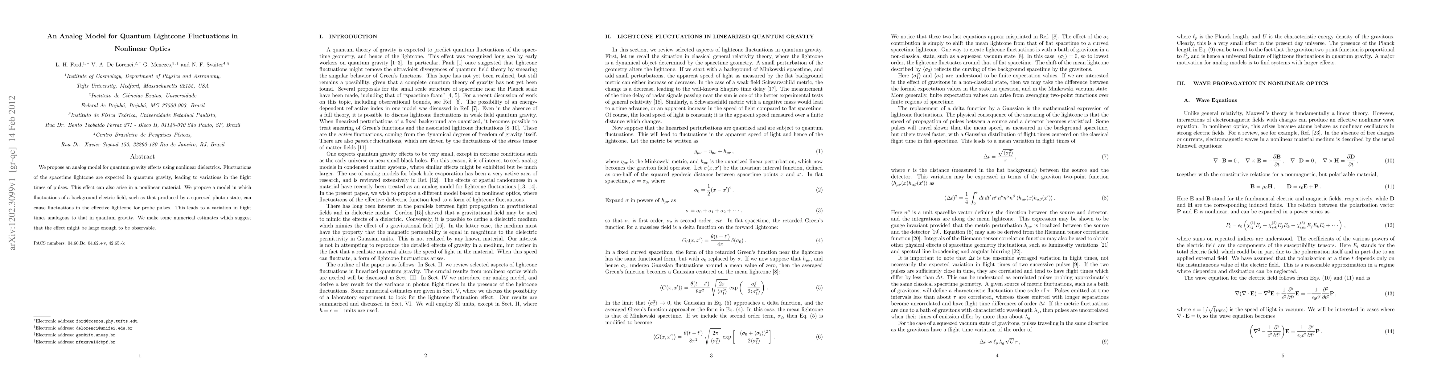 This paper proposes an analog model using nonlinear dielectrics to simulate quantum gravity effects, specifically lightcone fluctuations, by mimicking variations in pulse flight times through fluctuations in a background electric field. Numerical estimates suggest the effect could be observable in such materials.