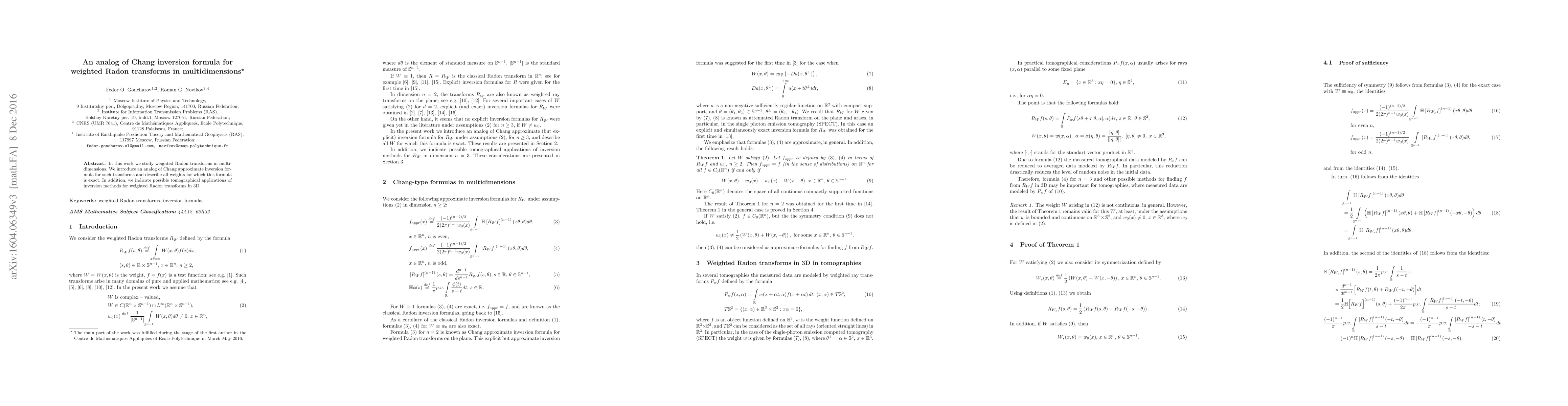 This paper introduces an analog of Chang's inversion formula for weighted Radon transforms in multidimensions, identifying the exact weights for which the formula holds, and explores potential tomographic applications in 3D.