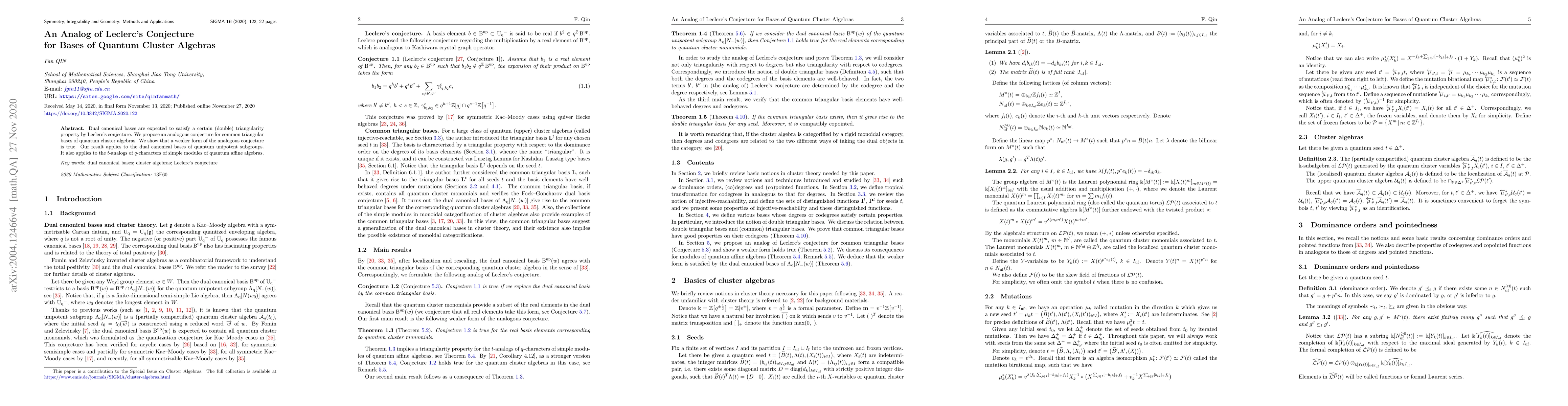 Dual canonical bases are expected to satisfy a certain (double) triangularity property by Leclerc's conjecture. We propose an analogous conjecture for common triangular bases of quantum cluster algebras. We show that a weaker form of the analogous conjecture is true. Our result applies to the dual canonical bases of quantum unipotent subgroups. It also applies to the $t$-analogs of $q$-characters of simple modules of quantum affine algebras.