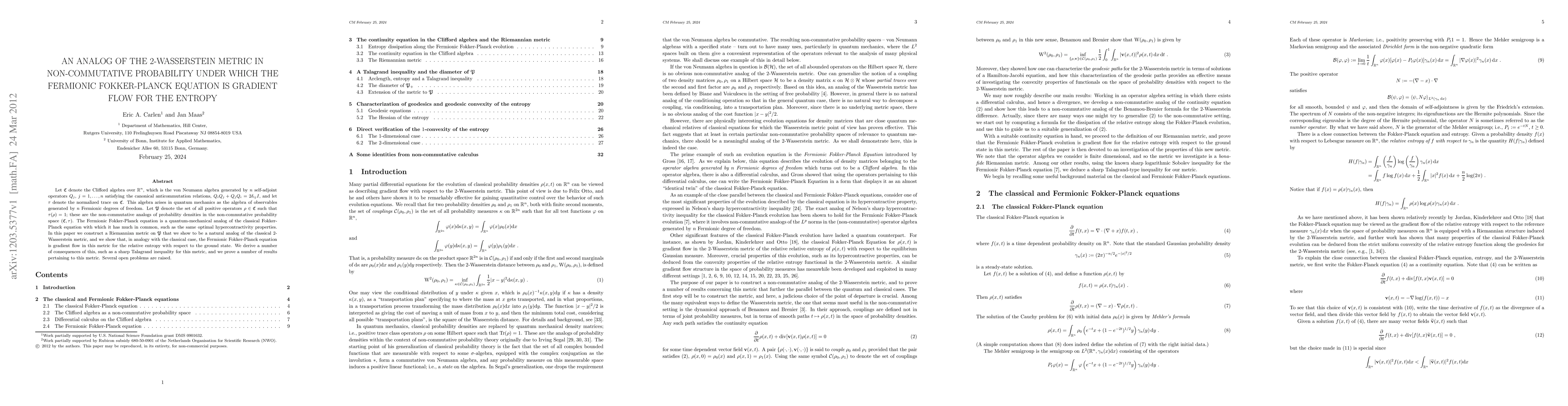 Researchers created a non-commutative metric analogous to the 2-Wasserstein metric to study the Fermionic Fokker-Planck equation's behavior in quantum mechanics, finding it is a gradient flow for relative entropy.