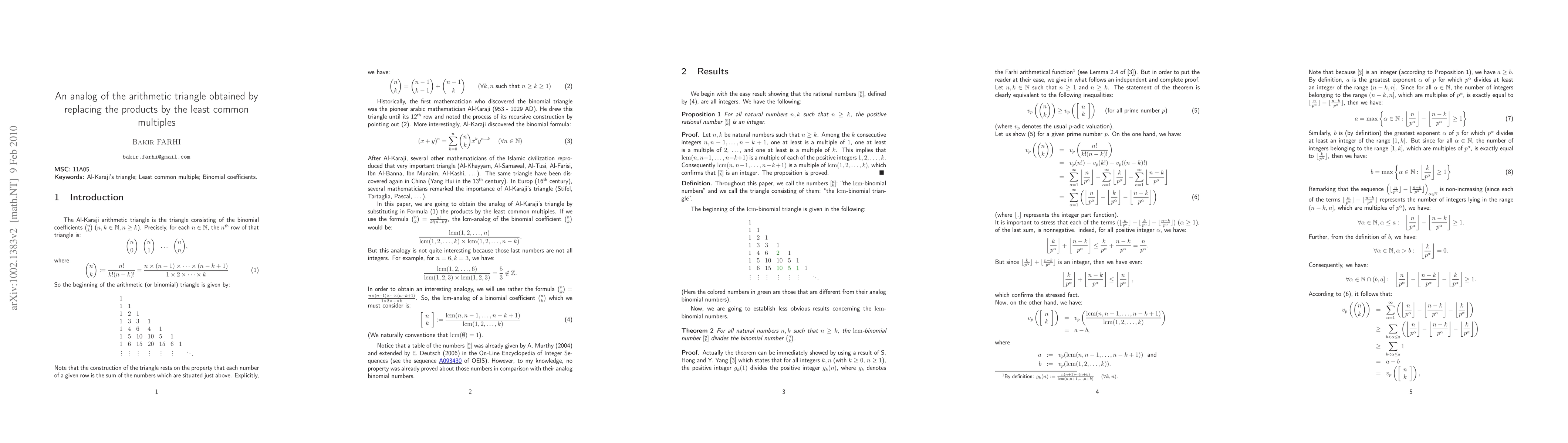 In this paper, we introduce an analog of the Al-Karaji arithmetic triangle by substituting in the formula of the binomial coefficients the products by the least common multiples. Then, we give some properties and some open questions related to the obtained triangle.