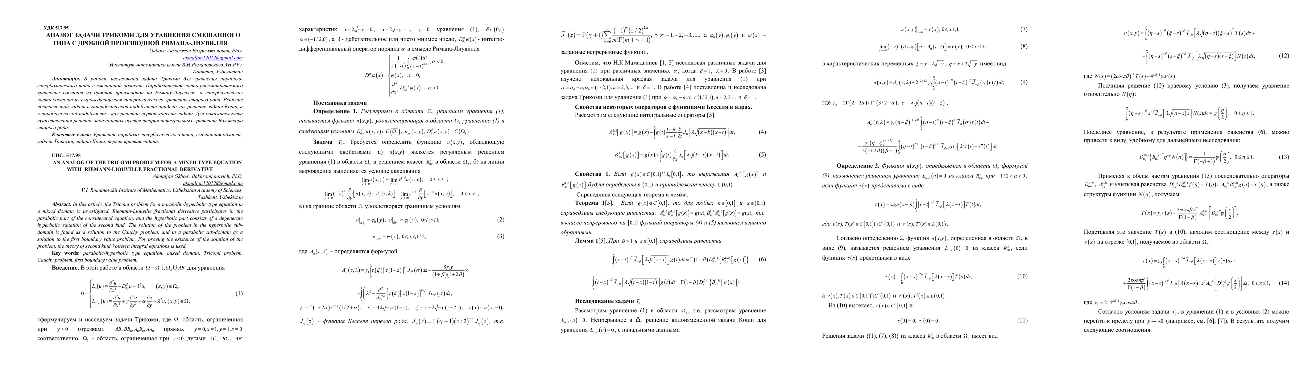Summary: This paper investigates the Tricomi problem for a mixed type equation involving a Riemann-Liouville fractional derivative in the parabolic part and a degenerate hyperbolic equation in the hyperbolic part. The focus is on solving the problem in a mixed domain.