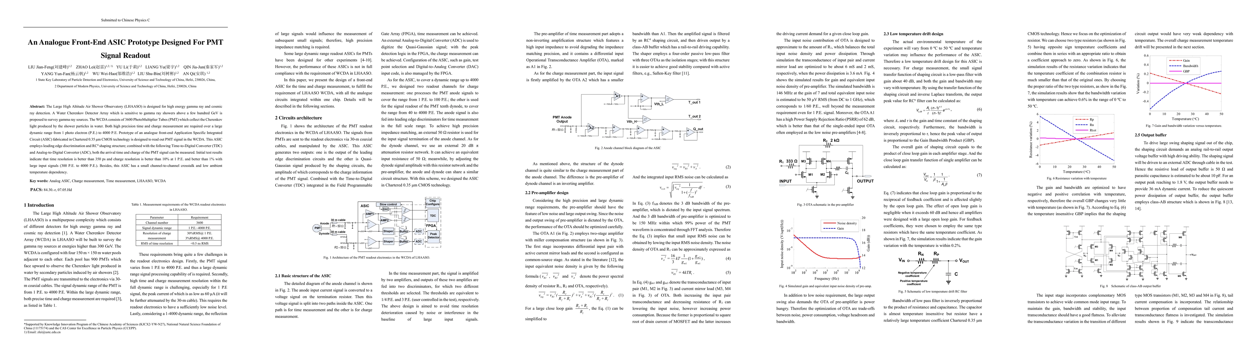 The Large High Altitude Air Shower Observatory (LHAASO) is designed for high energy gamma ray and cosmic ray detection. A Water Cherenkov Detector Array which is sensitive to gamma ray showers above a few hundred GeV is proposed to survey gamma ray sources. The WCDA consists of 3600 PhotoMultiplier Tubes (PMT) which collect the Cherenkov light produced by the shower particles in water. Both high precision time and charge measurement are required over a large dynamic range from 1 photo electron (P.E.) to 4000 P.E. Prototype of an analogue front-end Application Specific Integrated Circuit (ASIC) fabricated in Chartered 0.35 {\mu}m CMOS technology is designed to read out PMT signal in the WCDA. This ASIC employs leading edge discrimination and RC4 shaping structure; combined with the following Time-to-Digital Converter (TDC) and Analog-to-Digital Converter (ADC), both the arrival time and charge of the PMT signal can be measured. Initial test results indicate that time resolution is better than 350 ps and charge resolution is better than 10% at 1 P.E. and better than 1% with large input signals (300 P.E. to 4000 P.E.). Besides, this ASIC has a small channel-to-channel crosstalk and low ambient temperature dependency.