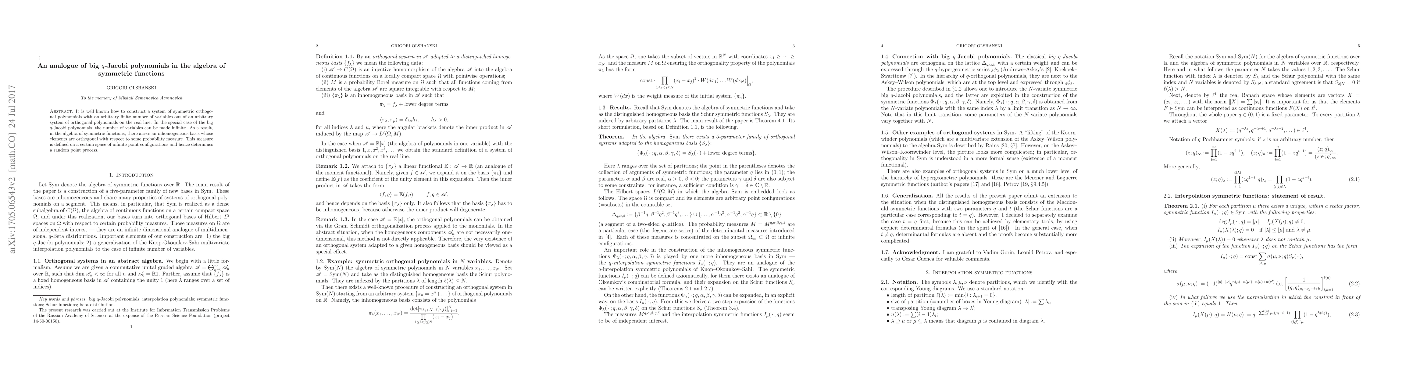 The paper constructs a five-parameter family of new bases in the algebra of symmetric functions, analogous to big q-Jacobi polynomials, and shows they behave like orthogonal polynomial systems. These bases embed the algebra of symmetric functions into continuous functions on a compact space, forming orthogonal bases for weighted Hilbert spaces linked to infinite-dimensional q-Beta distributions.