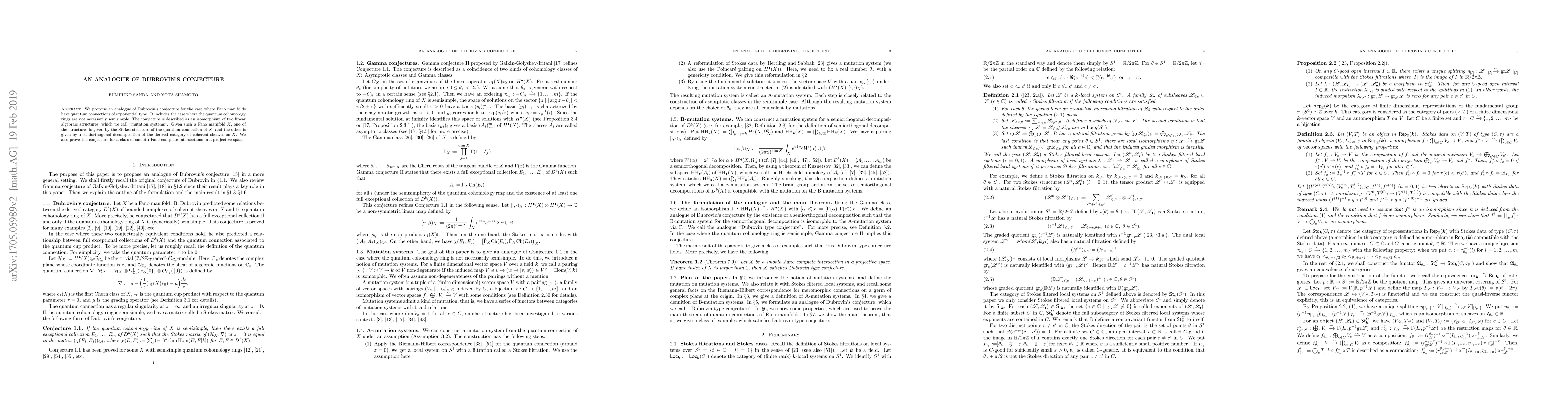 We propose an analogue of Dubrovin's conjecture for the case where Fano manifolds have quantum connections of exponential type. It includes the case where the quantum cohomology rings are not necessarily semisimple. The conjecture is described as an isomorphism of two linear algebraic structures, which we call "mutation systems". Given such a Fano manifold $X$, one of the structures is given by the Stokes structure of the quantum connection of $X$, and the other is given by a semiorthogonal decomposition of the derived category of coherent sheaves on $X$. We also prove the conjecture for a class of smooth Fano complete intersections in a projective space.