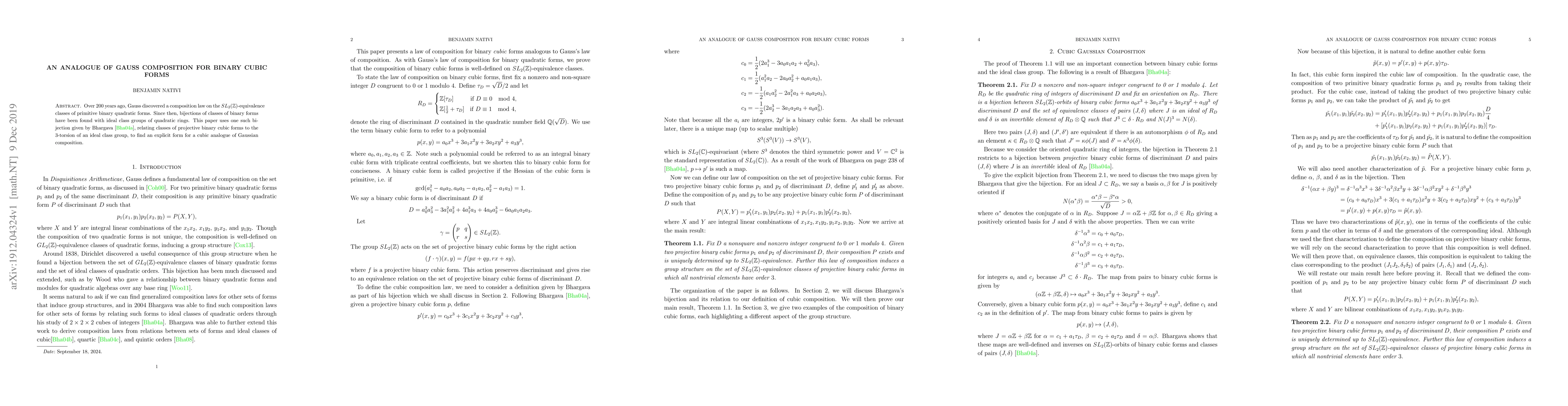 The paper presents an explicit construction of a cubic analogue of Gaussian composition, leveraging Bhargava's bijection between binary cubic forms and ideal class groups.