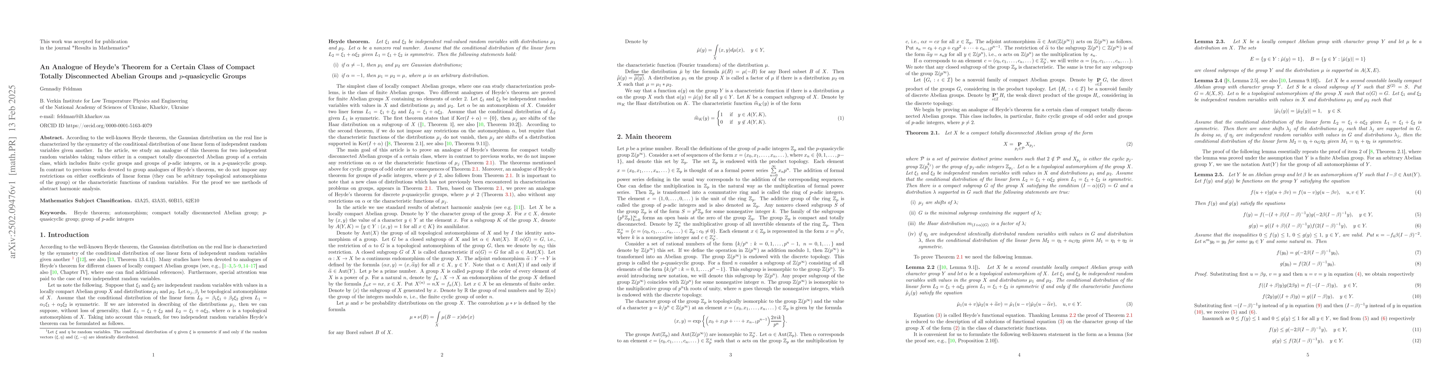 The paper employs abstract harmonic analysis to prove an analogue of Heyde's theorem for compact totally disconnected Abelian groups and p-quasicyclic groups, without imposing restrictions on coefficients or characteristic functions of random variables.