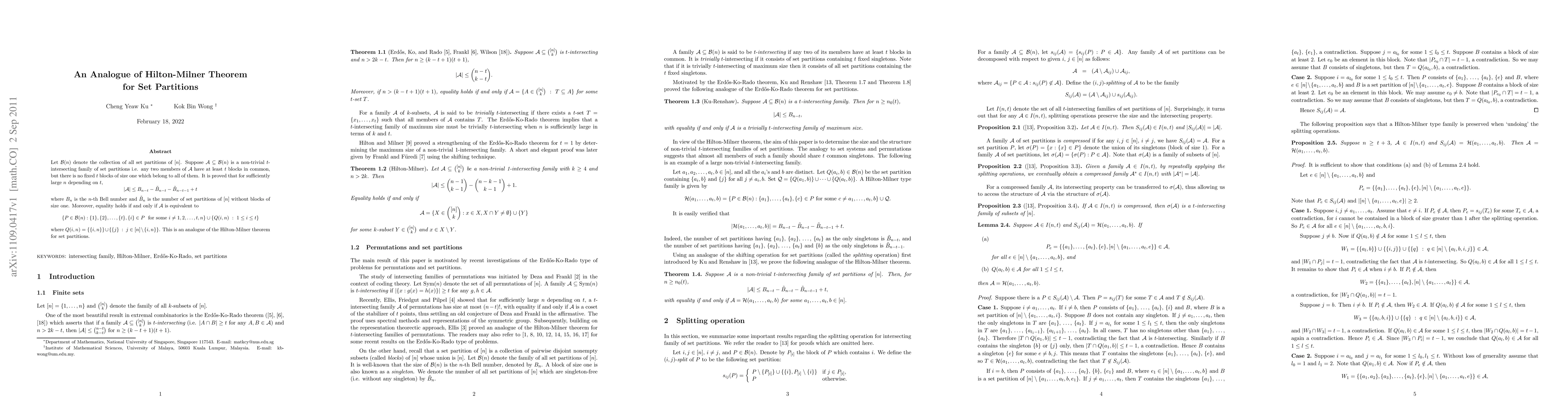The paper establishes an analogue of the Hilton-Milner theorem for set partitions, showing that a large family of t-intersecting partition families has a bounded size, with equality holding under specific conditions.